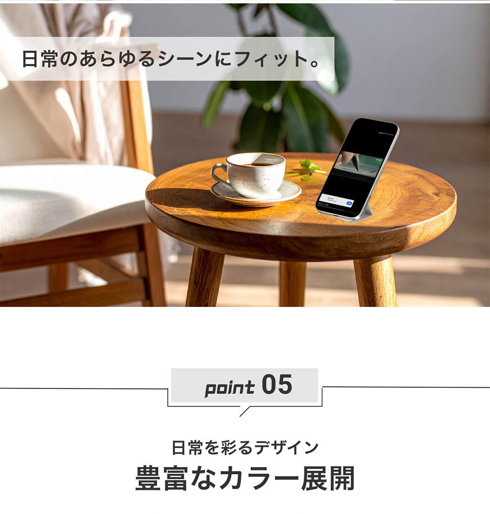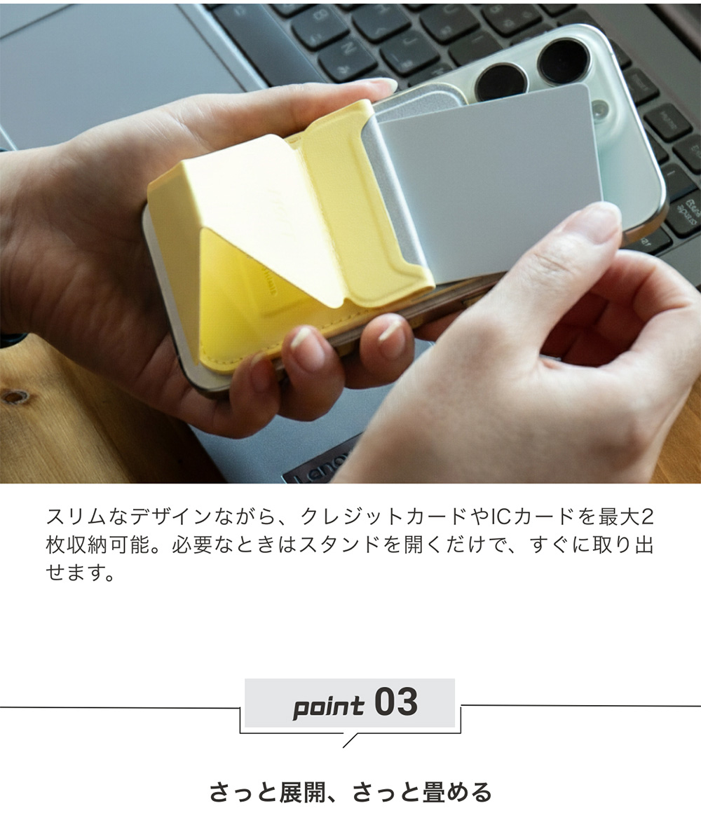 折りたたみ可能な構造を採用し、瞬時に展開して角度調整可能なスタンドに早変わり。しかも薄さわずか約6mm?6.5mm、重さ約43gと超コンパクトな設計です。