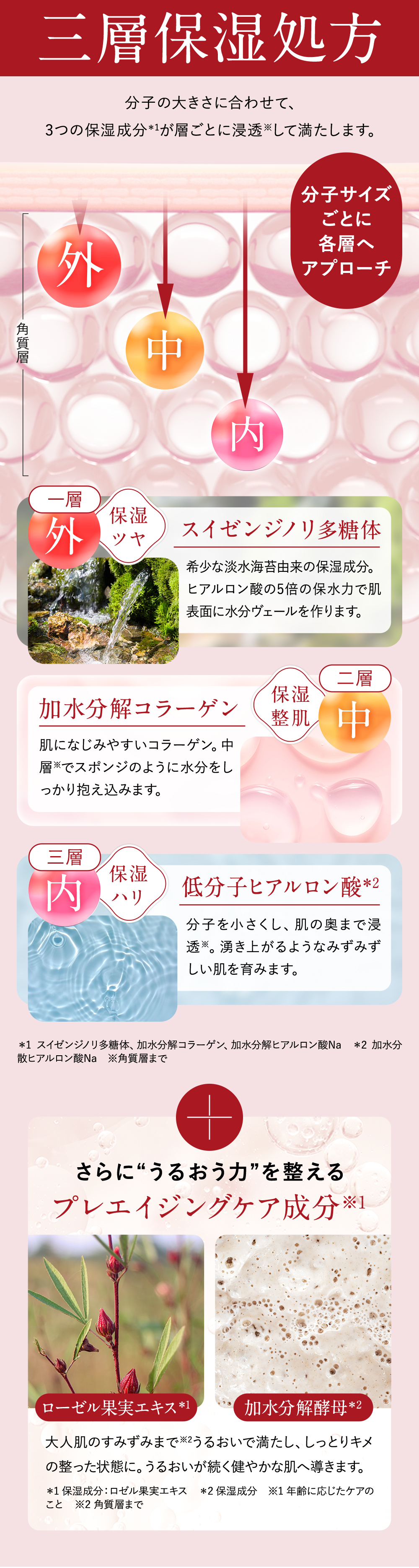 全成分 :水、グリセリン、BG、ビフィズス菌培養溶解質、ケトグルタル酸、キシリトール、トリ脂肪酸(C18-36)グリセリル、トリ脂肪酸(C12-18)グリセリル、ホホバエステル、スクワレン、マカデミアナッツ脂肪酸フィトステリル、トコフェロール、バチルス発酵物、加水分解コラーゲン、加水分解ヒアルロン酸Na、ツバキ種子油、スイゼンジノリ多糖体、ロゼル果実エキス、エリスリトール、加水分解酵母、クインスシードエキス、PEG/PPG/ポリブチレングリコール-8/5/3グリセリン、フィトステロールズ、1,2-ヘキサンジオール、カプリリルグリコール、ポリソルベート20、イソステアリン酸ポリグリセリル-10、キサンタンガム、クエン酸、クエン酸Na、EDTA-2Na、フェノキシエタノール、メチルパラベン