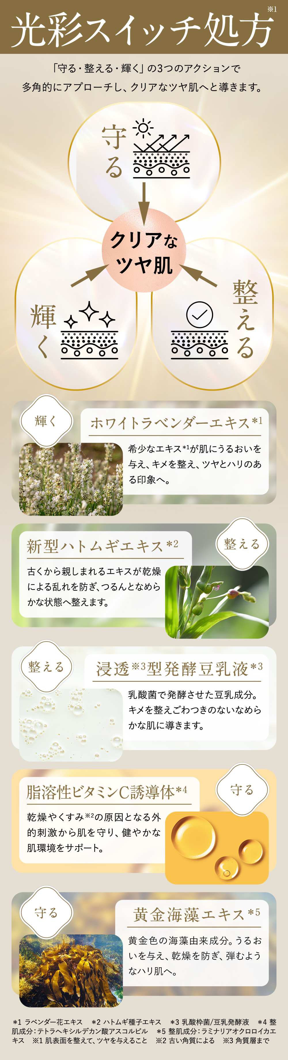 全成分 :水、グリセリン、BG、ビフィズス菌培養溶解質、ケトグルタル酸、キシリトール、トリ脂肪酸(C18-36)グリセリル、トリ脂肪酸(C12-18)グリセリル、ホホバエステル、スクワレン、マカデミアナッツ脂肪酸フィトステリル、フィトステロールズ、トコフェロール、バチルス発酵物、テトラヘキシルデカン酸アスコルビル、ラベンダー花エキス、乳酸桿菌/豆乳発酵液、ハトムギ種子エキス、ラミナリアオクロロイカエキス、トリ(カプリル酸/カプリン酸)グリセリル、(PEG-240/デシルテトラデセス-20/HDI)コポリマー、1,2-ヘキサンジオール、カプリリルグリコール、PEG -40水添ヒマシ油、キサンタンガム、クエン酸、クエン酸Na、EDTA-2Na、フェノキシエタノール、メチルパラベン