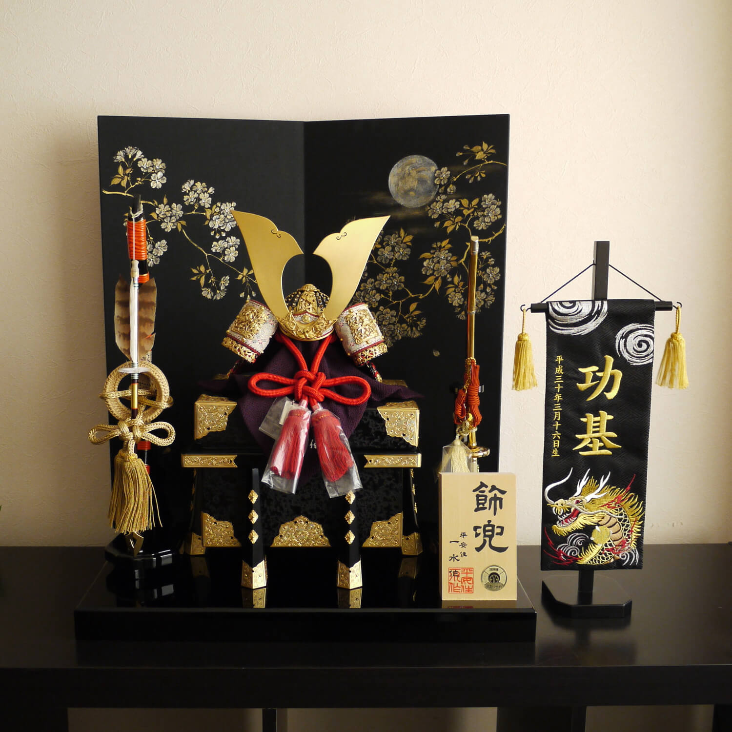 名前旗は、メインの柄部分に加えてお名前と生年月日にふっくら上品3D刺繍を施し、勇壮さを際立たせています。旗本体は地模様が美しいジャガード生地を、スタンドは海外製が多い中「越前塗」の福井県完全国産品をそれぞれ採用したこだわりの増村オリジナル。カラーも人気の金、銀、白などからお選びいただけます。