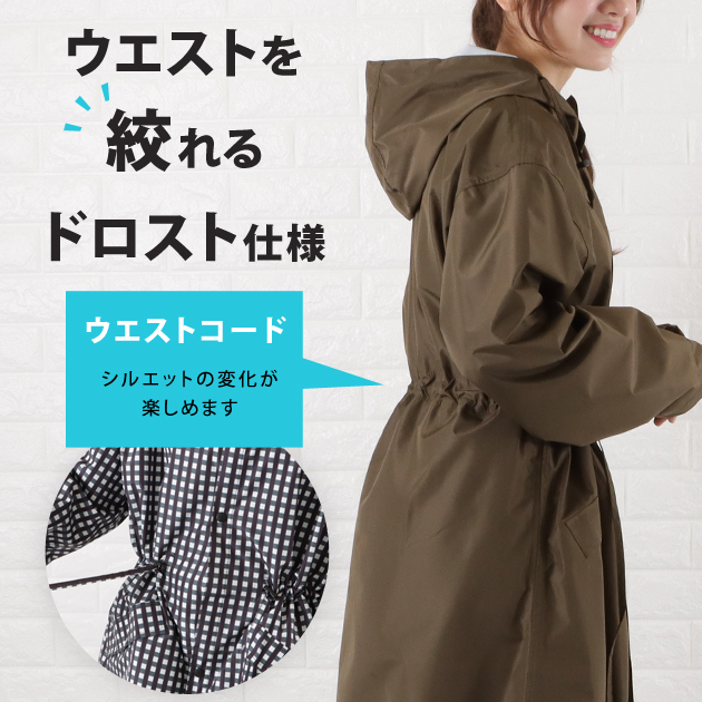 | 商品説明 | まるでスプリングコートのような、普通のコートに近いシルエットのオシャレなレインコートが新登場! 雨上がりにそのまま着ていても違和感がない高いデザイン性のアイテムです。 【こだわりの防水性】 撥水加工を施した生地なので、雨をしっかりブロック! ハイネックタイプとフードの絞り紐、ボタン&ファスナー、ゴム袖、足元までカバーするロング丈など雨の侵入を防ぐよう細部の作りにこだわりました。 【取り外し可!クリアバイザー】 視界を遮らず両手が使えるので雨の日も安全に自転車が運転できます。 顔が濡れないため化粧崩れの心配もなくなります。 【ウエストを絞れるドロスト仕様】 シルエットの変化が楽しめるウエストコード付き。 【軽量!持ち運びもラクラク】 薄手で軽いのでレインコートにありがちな重苦しさがありません。 また持ち運びのストレスもないため、雨が心配な時にバッグにさっと詰めやすい! 【前開きジッパー】 小雨で暑い時はジッパーを開けたり調節が簡単にできます。 また被るタイプよりも、着脱がスムーズに。 【様々なシーンで活躍】 通勤、通学、送り迎え、買い物、散歩、旅行、アウトドア、スポーツ観戦など色んな場面で利用可能! |