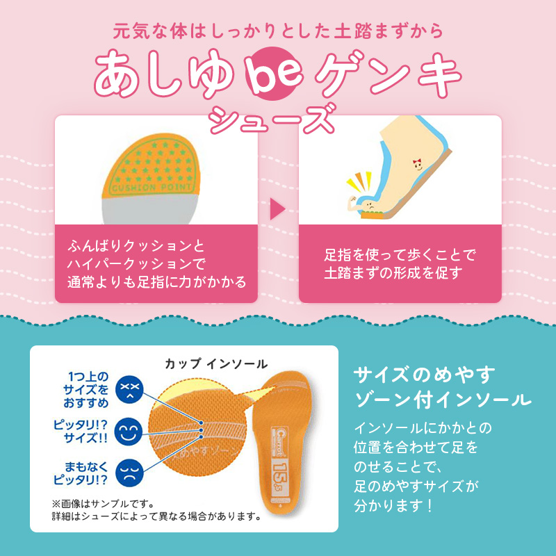 「こどもの足にいいことぜんぶ」の想いから生まれた機能シューズ「ムーンスター キャロット」HI!!シリーズのキッズシューズです。幅広のお子様に向けた「3E」商品です。トレンドを取り入れたボリュームのあるデザインです。カジュアルな服装に合わせやすく、お出かけやレジャーにおすすめの一足です。サイドには夜間の安全性を高める反射材を搭載。子どもの足の成長をサポートする「4つの機能(つま先ゆったり/カウンターボックス/フレックスジョイント/機能性カップインソール)」により、健やかな成長を促します。