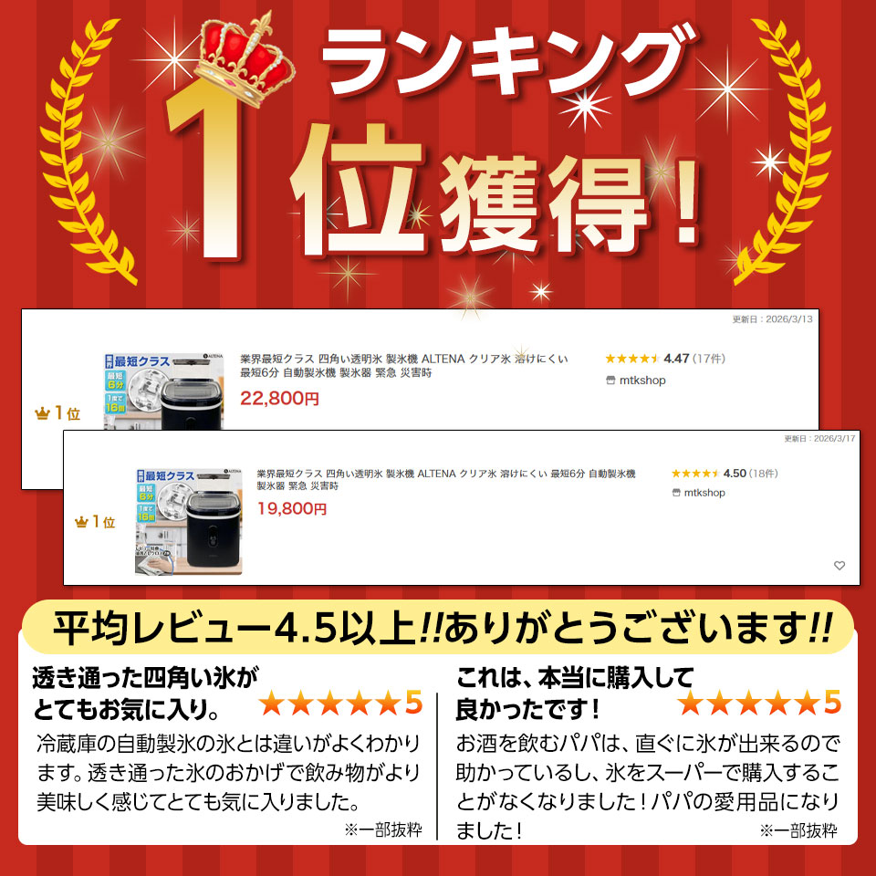 業界最短クラス 四角い透明氷 製氷機 ALTENA クリア氷 溶けにくい 最短6分 自動製氷機 製氷器 緊急 災害時