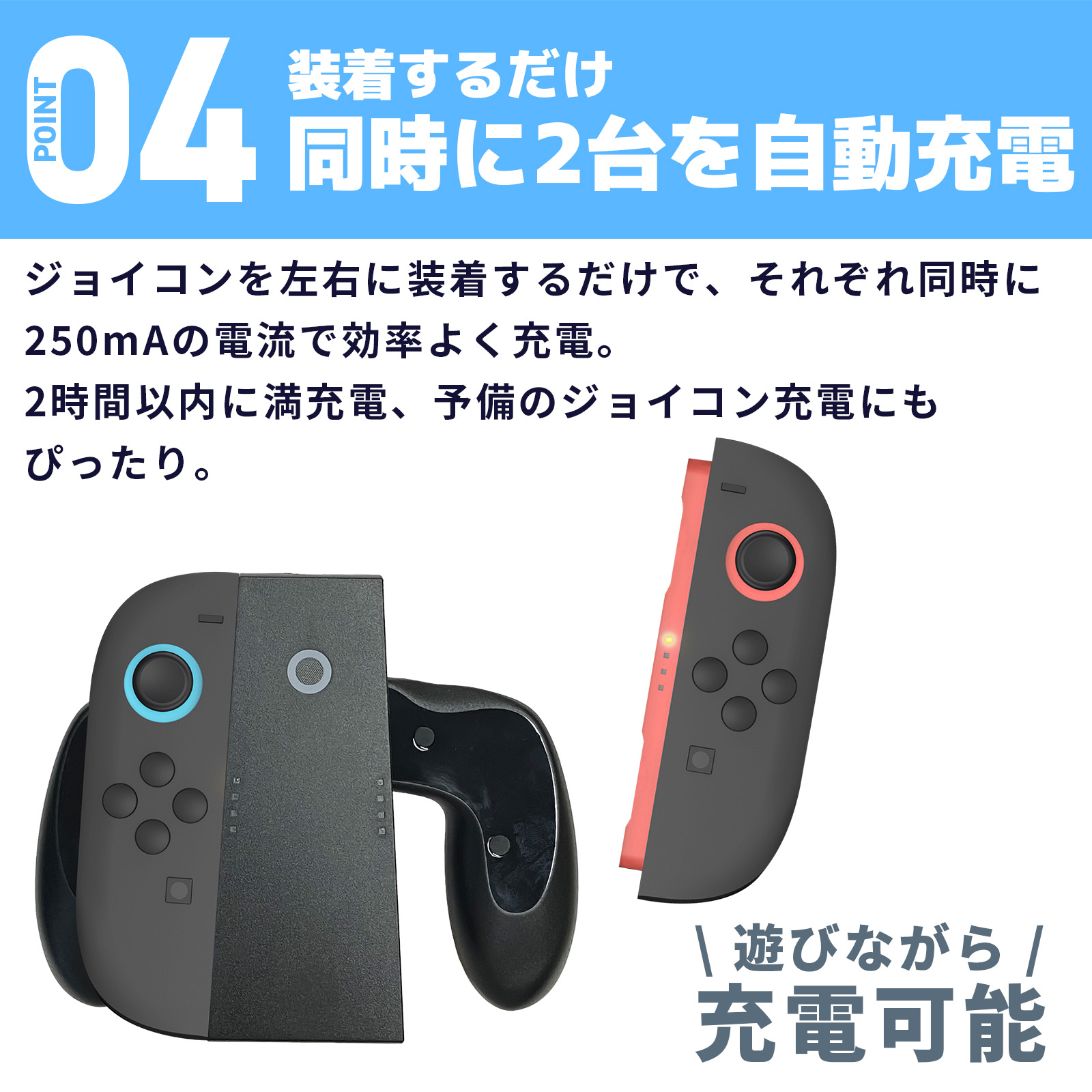 | 特徴 | 【 ついに登場!便利な充電スタンド 】 【 優れた5つの特徴 】 (1) ゲームをしながらJoy-Conを充電できる (2) 左右のJoy-Conを同時に充電可能 (3) 充電状態がわかるライト付き (4) 持ちやすく、長時間のプレイも快適 (5) 使い方が簡単で、すぐに使える 【 ゲーム中も充電できる 】 Joy-Conをグリップに装着すれば、ゲームをしながら充電できます。 【 2つ同時に充電OK 】 左右のJoy-Conを同時に充電できるので、予備のコントローラーもすぐに使えます。 【 ライトで充電状態がわかる 】 充電中はオレンジ、完了すると七色、待機中は白に光るので、状態がすぐにわかります。 【 持ちやすいデザイン 】 手にフィットする形で、長時間のゲームも疲れにくいです。 【 簡単3ステップで使える 】 USBに接続→ライトを確認→Joy-Conを装着するだけで使えます。 |