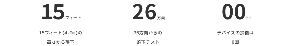 落下高さ122cm落下方向26方向(8角、12稜、6面)の製品落下試験をクリアすることと規定された、米軍採用品の選定に用いられるアメリカ国防総省が定めた試験法規格「MIL-STD-810G, Method 516.6 Procedure IV」をクリアしています。