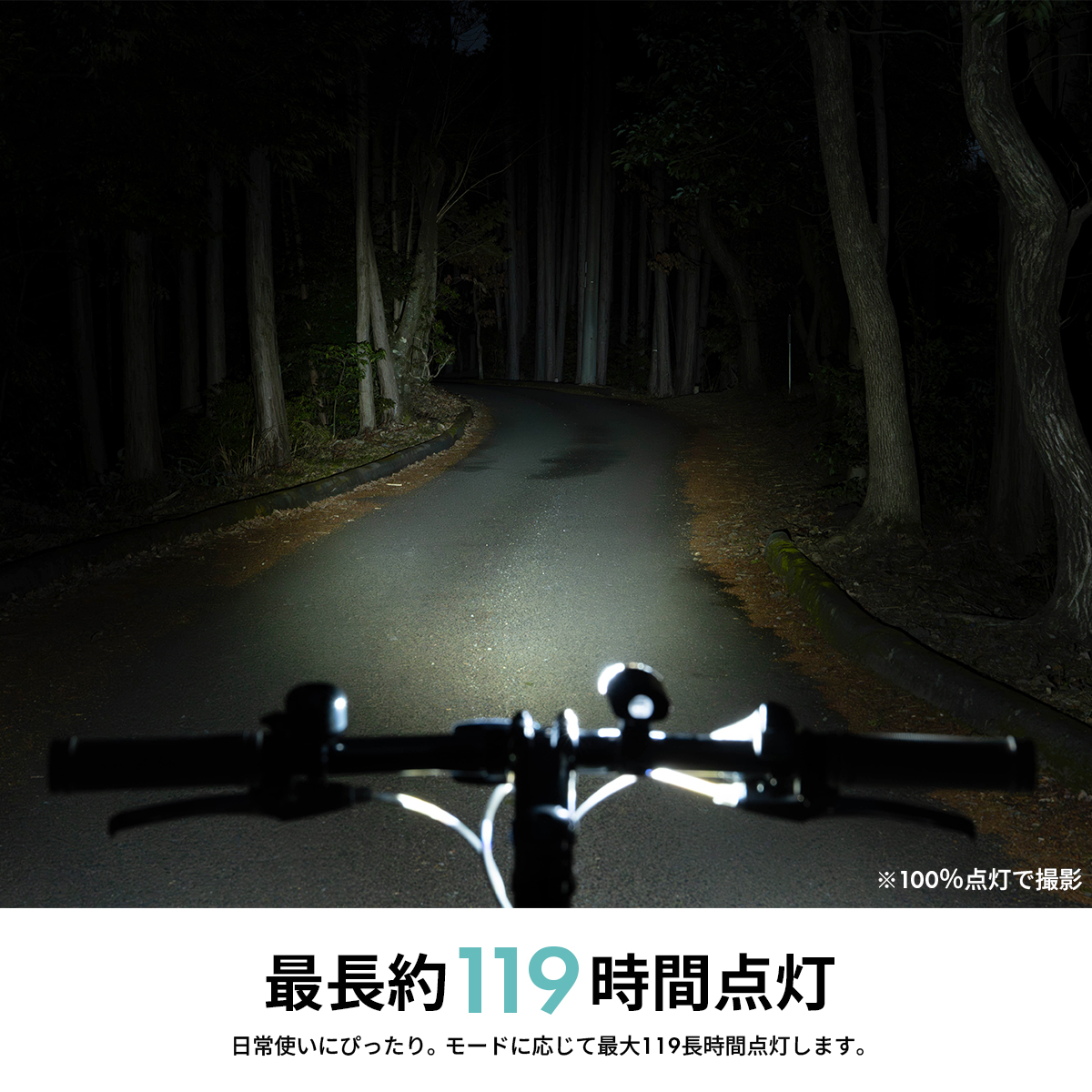 省エネ設計により、使用モードに応じて約48〜119時間の長時間点灯が可能で、日常の通勤・通学から長距離ライドまで活躍します。