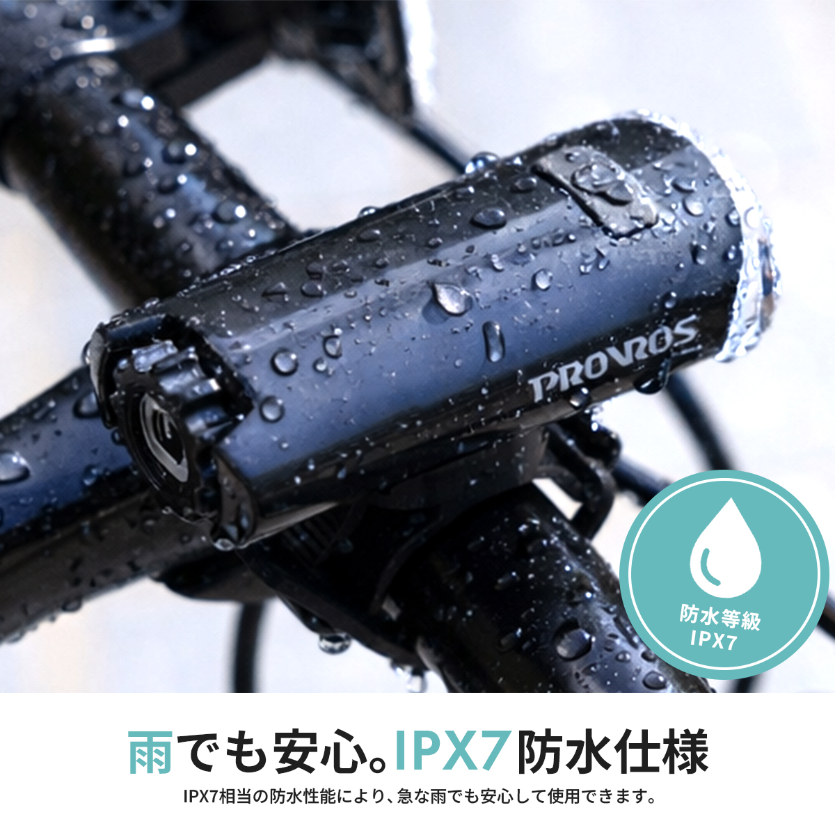 IPX7相当の防水性能を備え、水に強く、外出中の急な雨でも安心して使える電池式サイクルライトです。