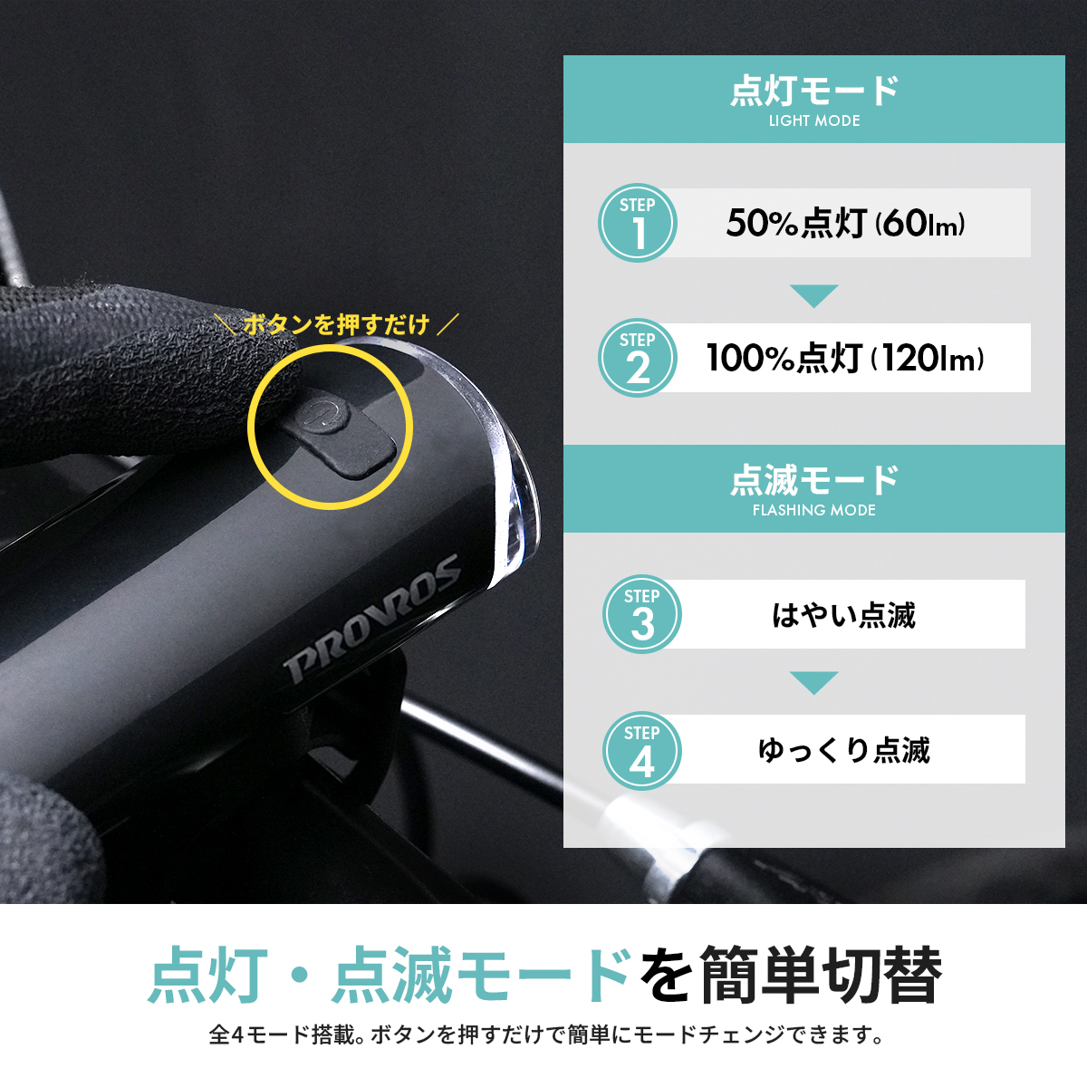 明るさは2段階に切り替え可能で、さらに2種類の点滅モードも搭載。用途や走行環境に合わせてお好みのモードを選べます。(夜間走行時は点灯モードをご使用ください)