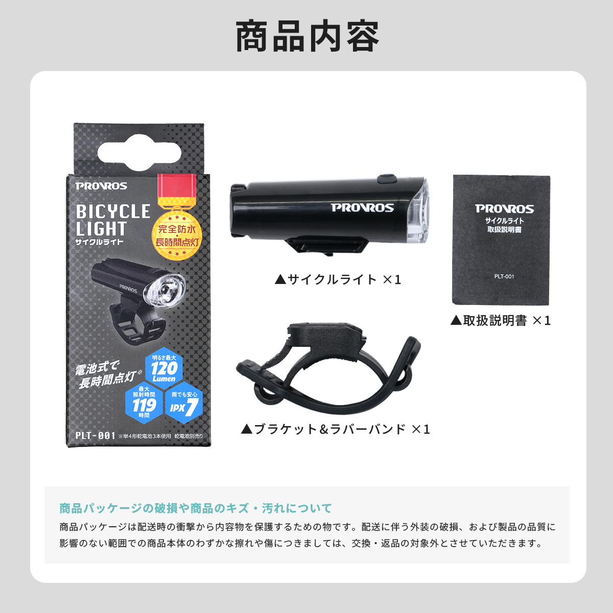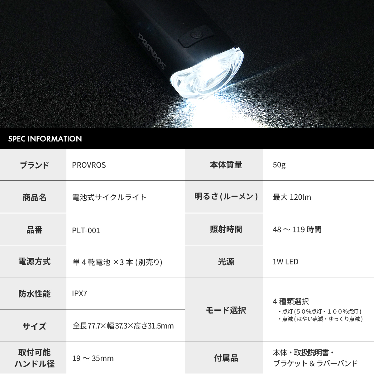PROVROS 自転車 LEDライト サイクルライト 乾電池式 防水 IPX7 4モード 小型 コンパクト 点灯 点滅 前照灯 プロブロス PLT-001