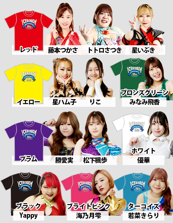アイスリボン旗揚げ20周年を記念し、選手カラーを採用したTシャツが受注生産で登場!!