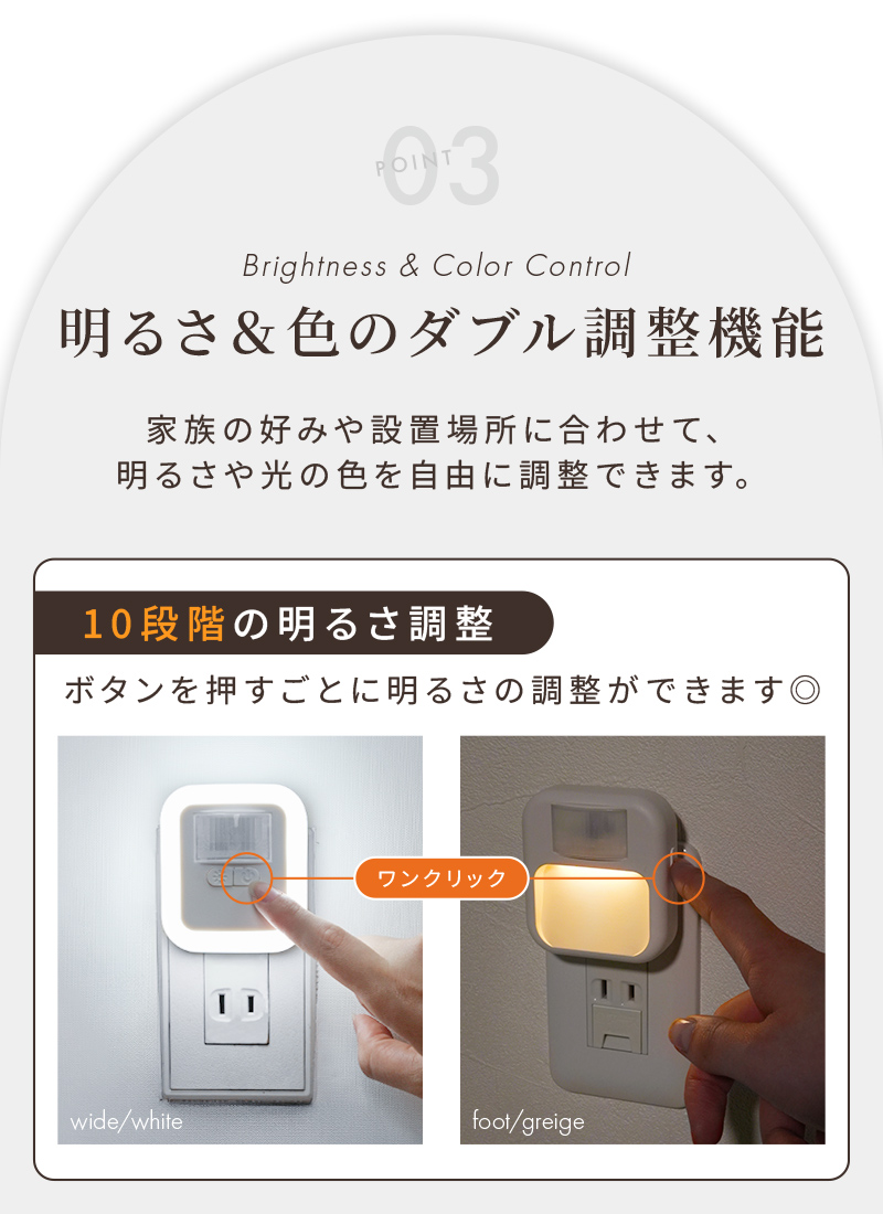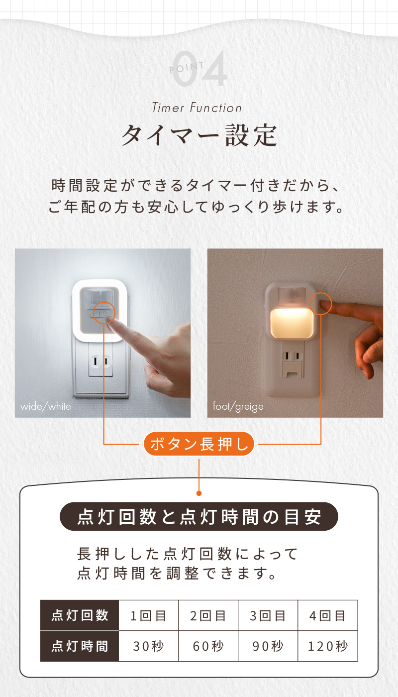 点灯時間は4段階、明るさは10段階で自由に調整可能◎