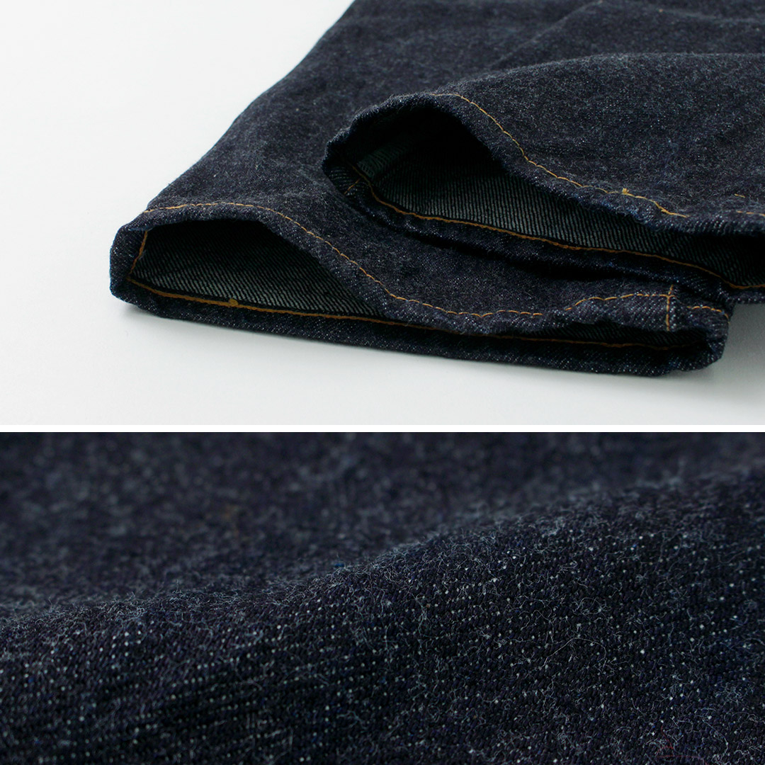 旧式織機で高密度に織り上げ、あえて毛焼き処理は行わず、パリッとしたハリ感を残した仕上がりに。ロープ染色を繰り返すことで濃色に染め上げていますが、穿き込むほどに肌触りは柔らかくなり、風合いが深まっていきます。