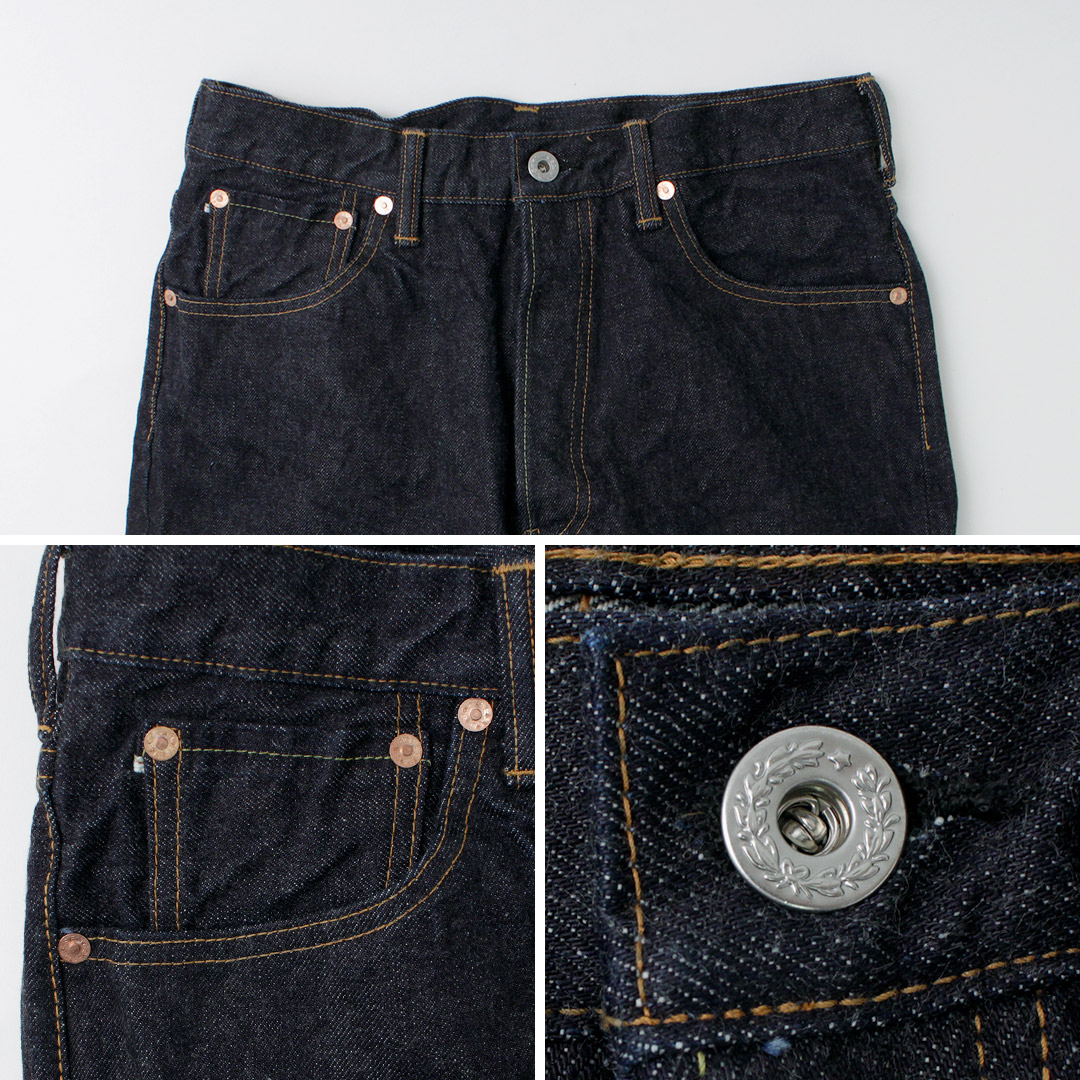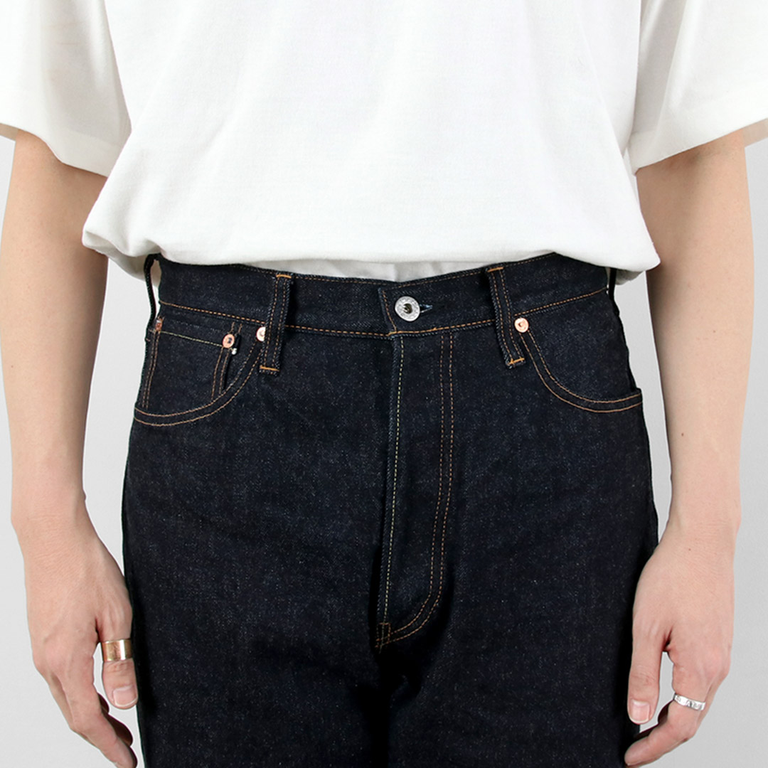 裾やコインポケットにはセルヴィッチを使用し、リベットはヘッドを潰した当時の仕様を再現。鹿革のオリジナルレザーパッチには、「作り手と穿く人をつなぐ懸け橋でありたい」というブランドの想いが込められています。