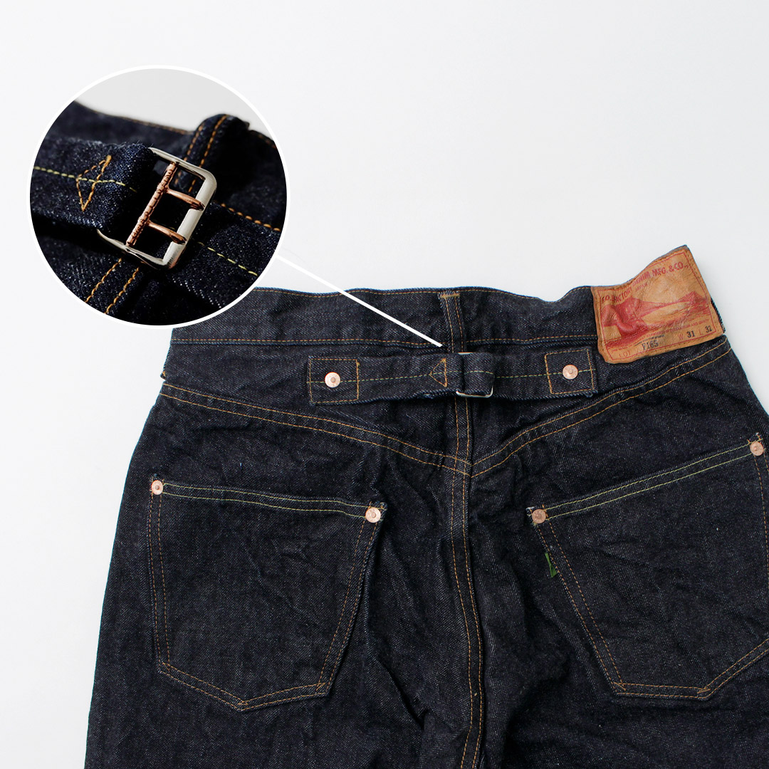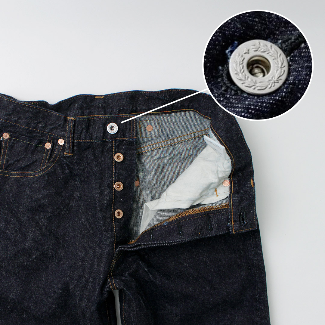 フロントはボタンフライ仕様で、トップには月桂樹のドーナツボタンを採用。背面にはシンチバックを配し、クラシックな佇まいを演出しています。