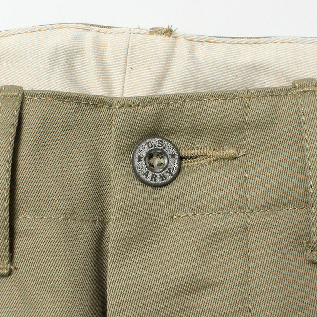 当時としては希少だった2本針巻き縫い仕様や、U.S. ARMY刻印のメタルボタン、両玉縁ポケットなど、手間と技術を要するディテールを惜しみなく投入。股上は深く、太さのあるシルエットで、無骨さと実用性を兼ね備えています。