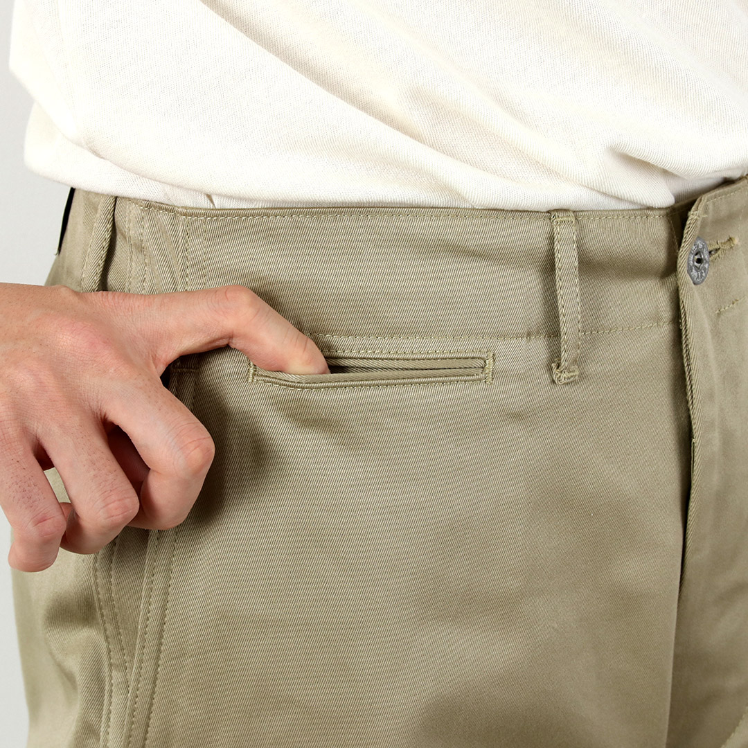 ノンウォッシュ仕様のため、穿き込みによる表情の変化も楽しめる一本。“ただのチノパン”では終わらない、背景ごと所有したくなるミリタリーチノです。