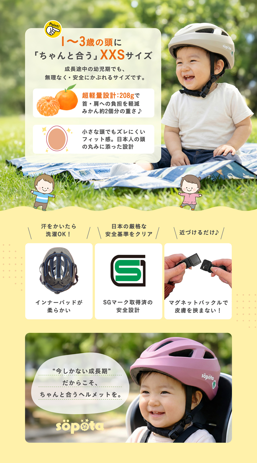 【返品交換保証】SGマーク sopota 自転車 ヘルメット 子供 SG規格 マグネットバックル 新XXS/1〜3歳 新S/3〜6歳 新M/6歳以上 幼児 子供用 ソポタ SOP-CH