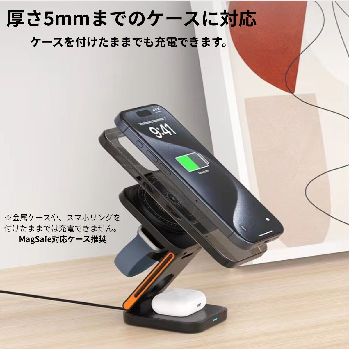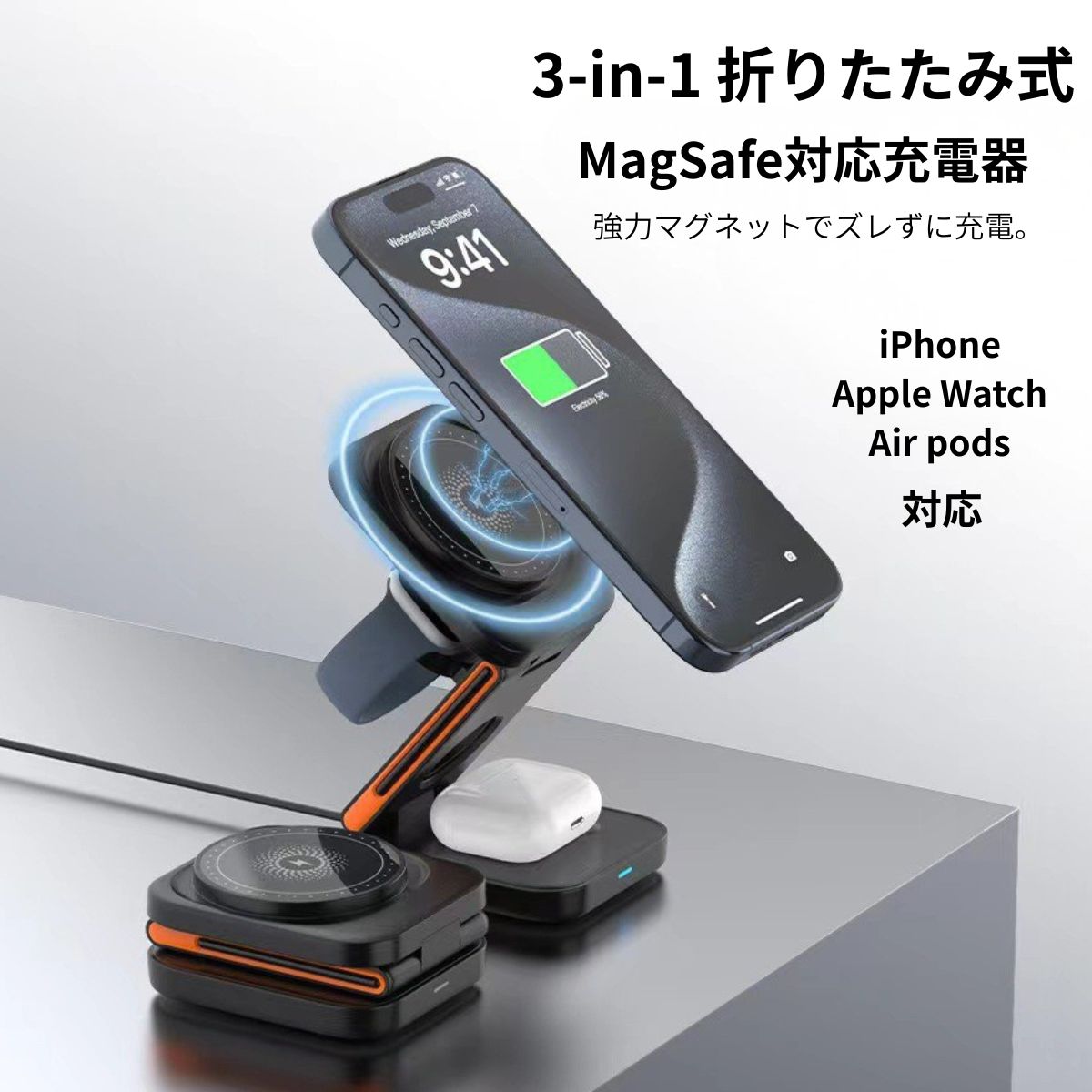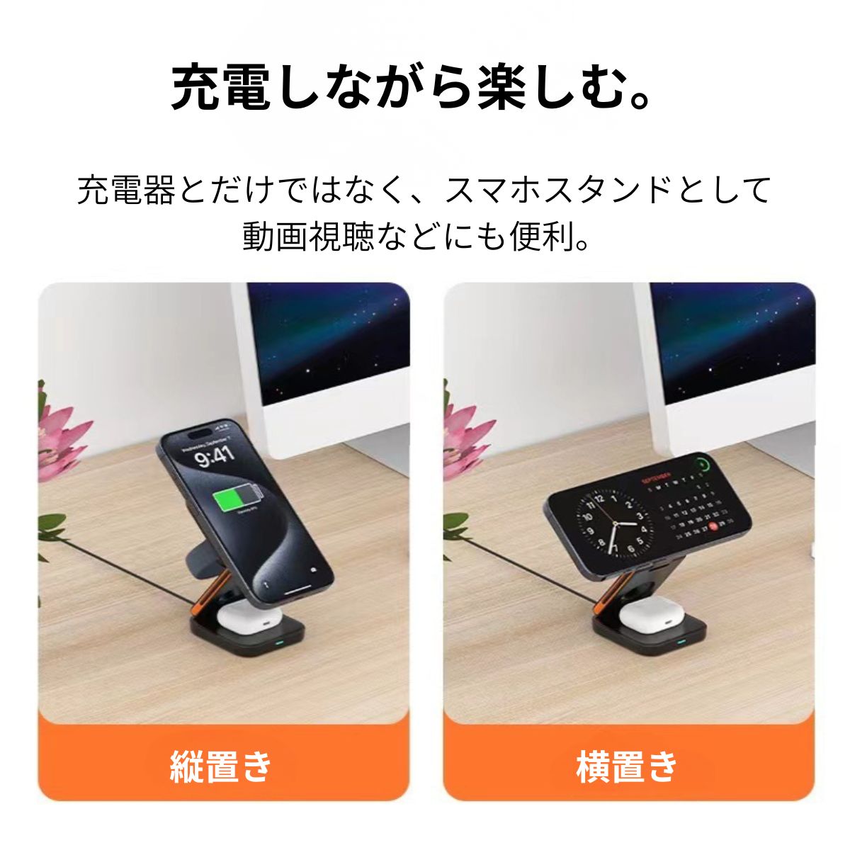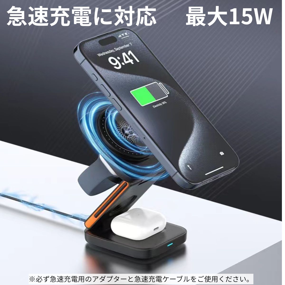3in1 ワイヤレス充電器 MagSafe対応 マグネット式 15W急速充電 折りたたみ スマホ スタンド iPhone AppleWatch AirPods 同時充電 Qi