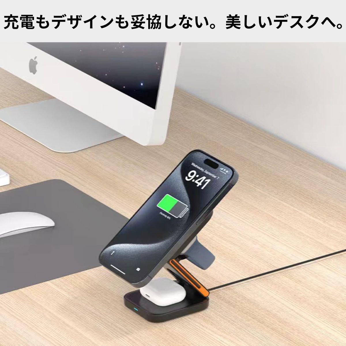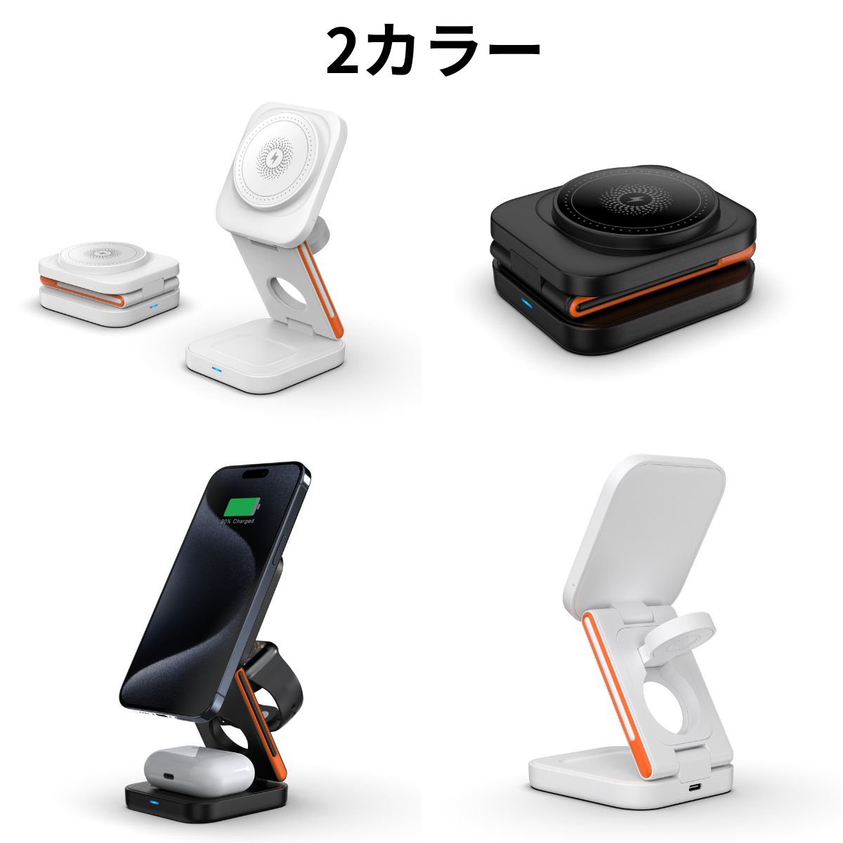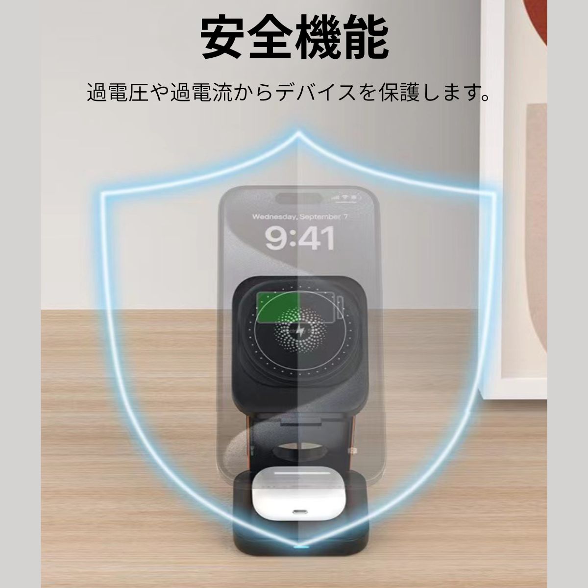 3in1 ワイヤレス充電器 MagSafe対応 マグネット式 15W急速充電 折りたたみ スマホ スタンド iPhone AppleWatch AirPods 同時充電 Qi