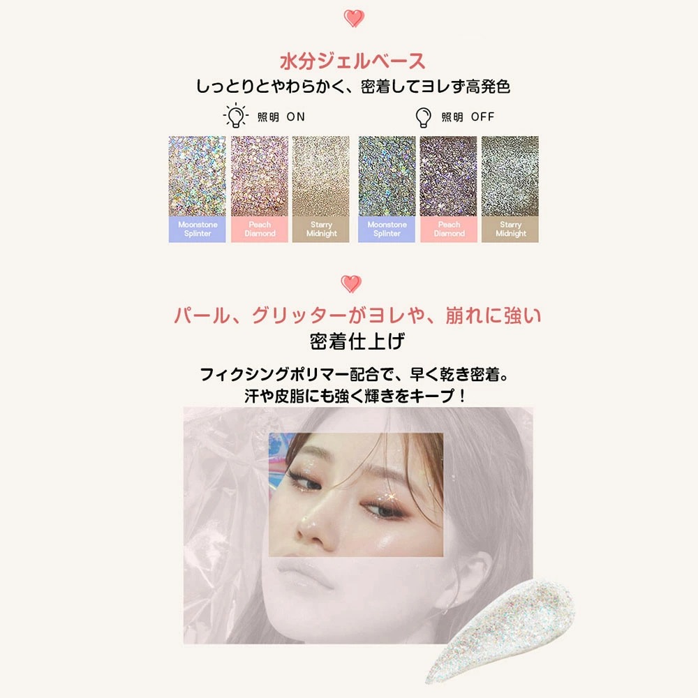 | 商品の特徴 | 【アイメイクにプラスして目元に究極のきらめき】 ■アイメイクブラシが付属されたスタイリッシュなデザイン ■ポップシノートだけの、簡単キレイにグリッター、アイメイクができるブラシを付属したスタイリッシュなパッケージ ■大小さまざまな大きさの黄金比でつくられた輝きグリッター ■フィクシングポリマーで、グリッター、パールが飛ばず高密着 ■ピンセット付きなので衛生的かつ簡単にガーゼパッドを取り出せます。 ■毛先にコシがあり、グリッターを簡単に目元へのせられるブラシ 【黄金比率グリッター、様々なグリッターが、光を集めさまざまな輝きを放つ究極のきらめき】 ■ムーンストーンスプリンター:見る角度によって色が変わるムーンストーンのように神秘的でカラフルな光のオーロラグリッター ■ピーチダイヤモンド:魅惑的なピンクのダイヤモンドを磨いたように愛らしく輝くピーチダイヤモンドグリッター ■スターリーミッドナイト:真夜中の輝く星をそのまま集めたようなスターリーミッドナイトグリッター 【しっとりとし、肌にのせると速乾性のある水分ジェルテクスチャー】 ■水分ジェルベースでしっとりとやわらかく、密着してヨレず高発色 ■パール、グリッターがヨレや、崩れに強い密着仕上げ ■フィクシングポリマー配合で、早く乾き密着。汗や皮脂にも強く輝きをキープ! ■グリッターと相性のいい弾力のあるブラシで、簡単にポイントメイクが完成! <メーカー希望小売価格はメーカーカタログに基づいて掲載しています> |
