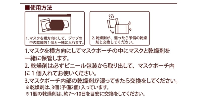 2.乾燥剤は必ずビニール包装から取り出して、マスクポーチ内に1個入れてお使いください。