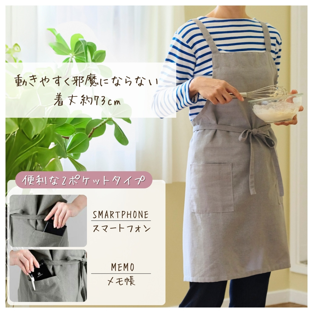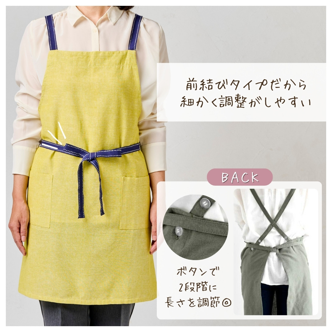 綿花から紡いだ糸でしっかりと織られた生地を用いているので毎日着ていただいても長く使える優しい着心地のエプロンです。