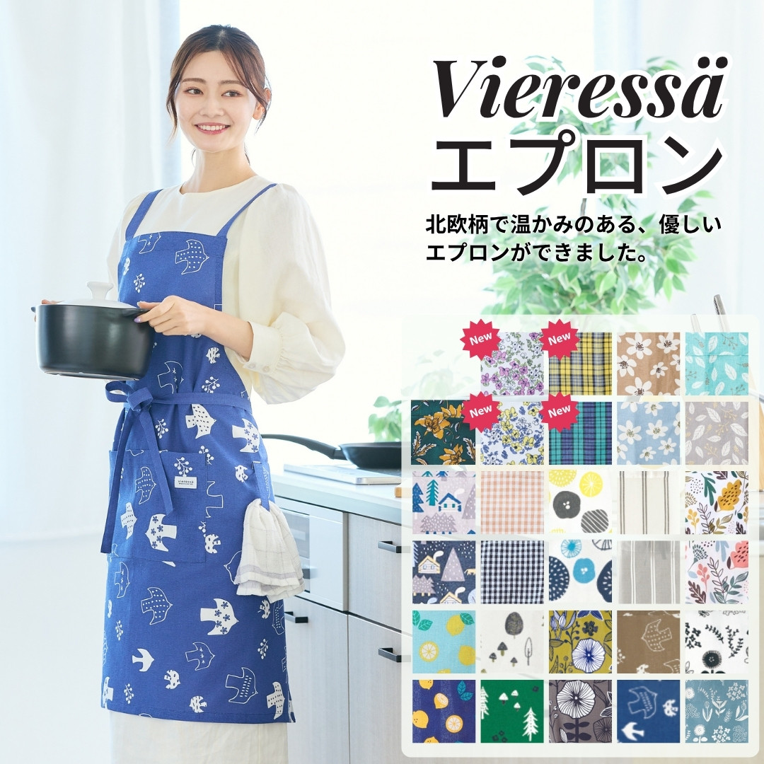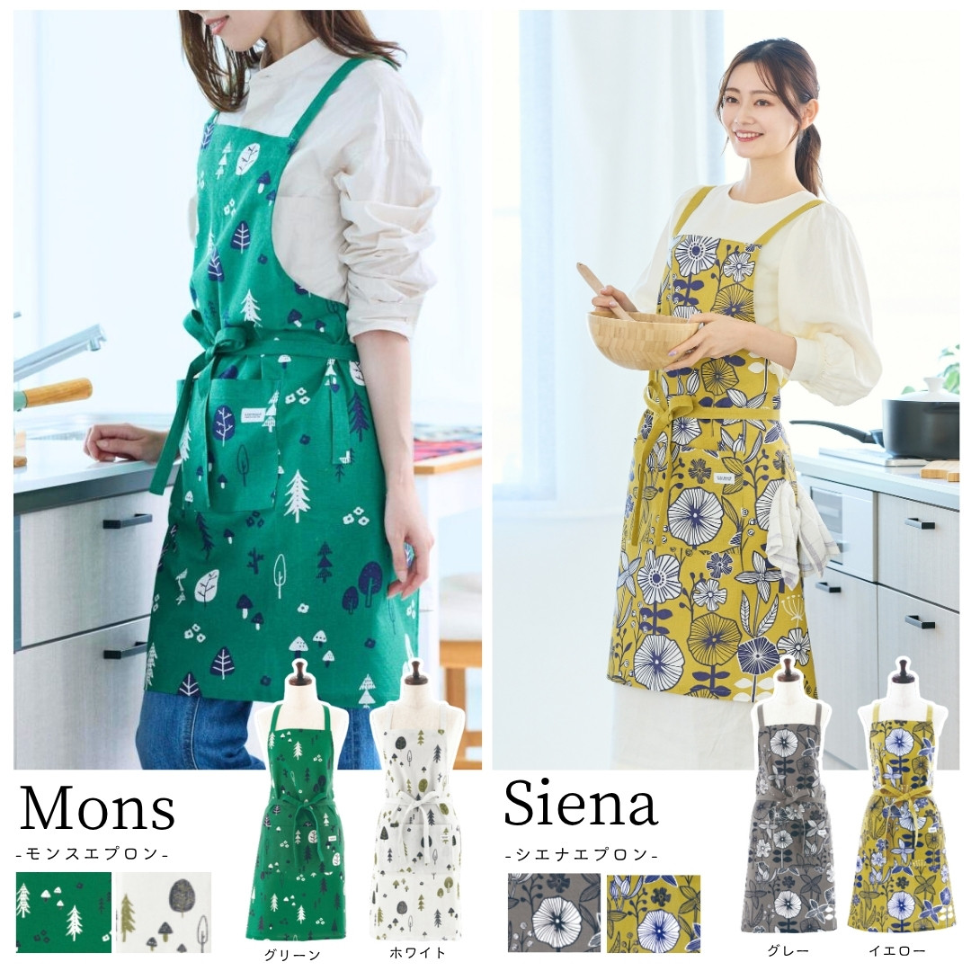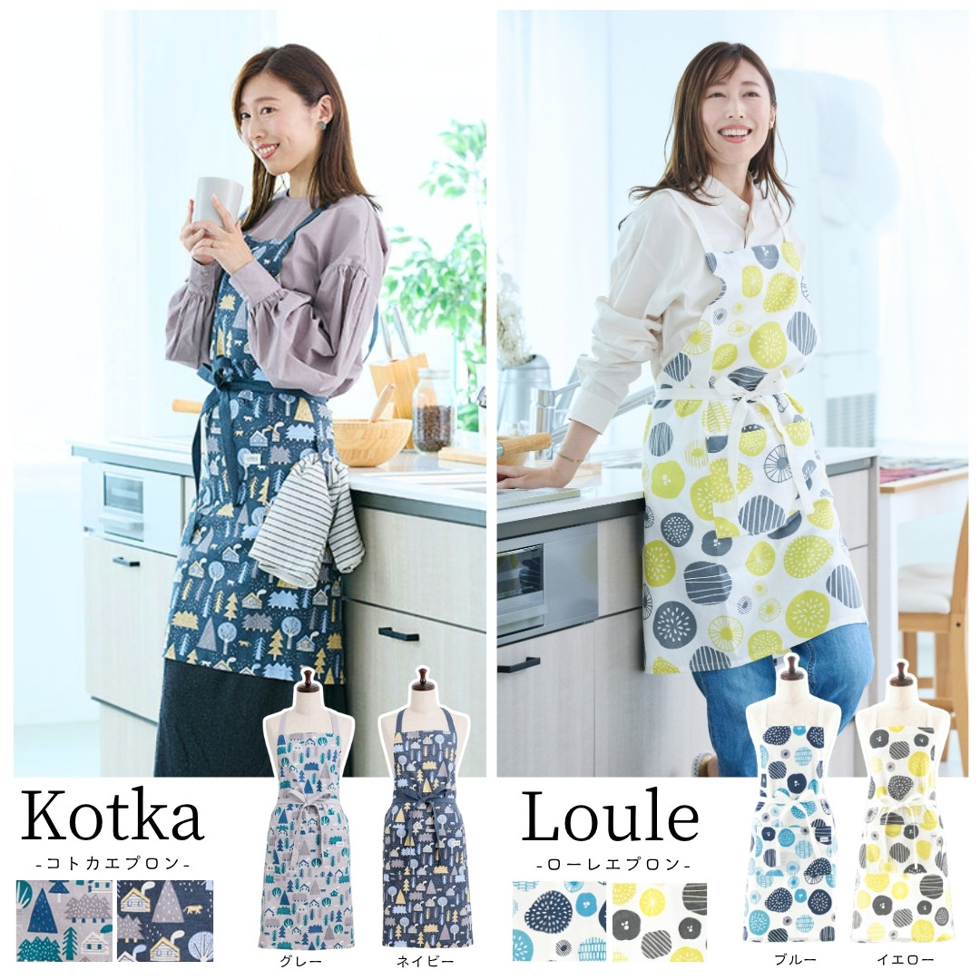 北欧柄で温かみのある、優しいエプロンができました。インド綿のナチュラルな生地感と、使うことにより変化する色合いで自分だけの特別なエプロンになります。