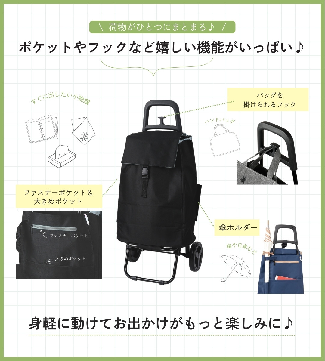 雨の日に便利な傘ホルダーや、背面にファスナーポケット・大きめポケットが付いているなど、使う人に嬉しい機能が満載です