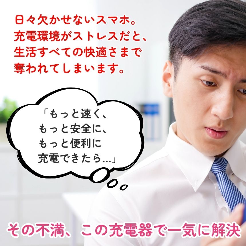 ケーブル探し、差し込みの手間、絡まる配線…。さらにワイヤレス充電は遅い、熱くなる、対応機種が限られる、そんな不満も多く聞かれます。