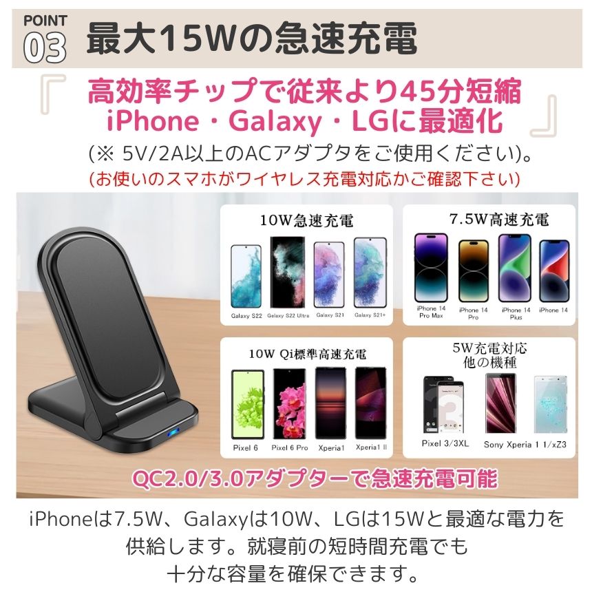 (2) 急速充電対応:高効率チップで最大15W充電。