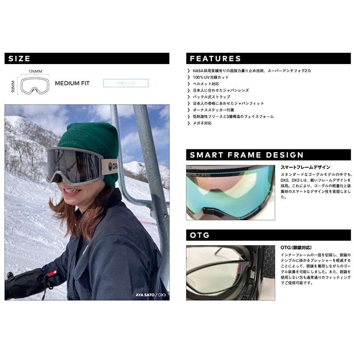 ■DX3 パノラマ視野で大人気のPXVモデルを参考にデザインされたスタンダードモデル。 ワイドな視野、軽量性、柔軟性、装着時のデザイン性、大きすぎない中間サイズなど、トータルバランスに優れたゴーグルとして、ジャパンチームライダーの使用率が男女トータルで最も多いモデルです。 迷ったらDX3がおススメです。 A standard model designed with inspiration from the popular PXV model known for its panoramic view. With wide field of vision lightweight construction flexibility stylish appearance when worn and a not-too-large medium size this goggle offers exceptional overall balance. It is the most commonly used model among both male and female riders on the Japan team. If you're unsure the DX3 is highly recommended.