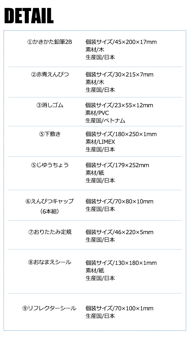 ●サイズ:文具9点セット「下敷き」「2Bえんぴつ」「赤青えんぴつ」「じょうぎ」「消しゴム」「じゆうちょう」「えんぴつキャップ」「おなまえシール」「リフレクターシール」