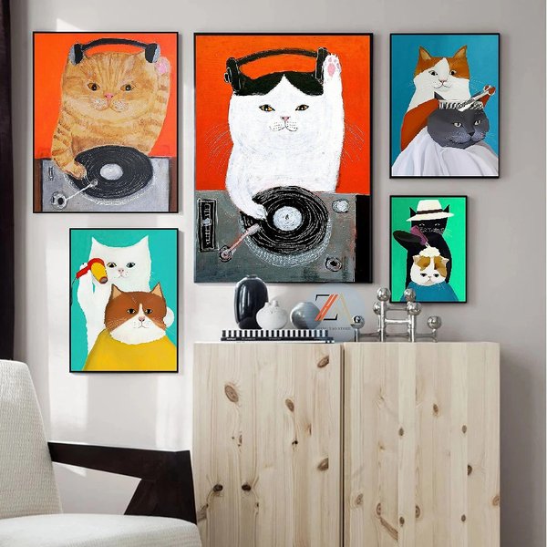ポスター おしゃれ 額付 アートポスター 動物イラストシリーズ ネコ・DJ デザインNO-2