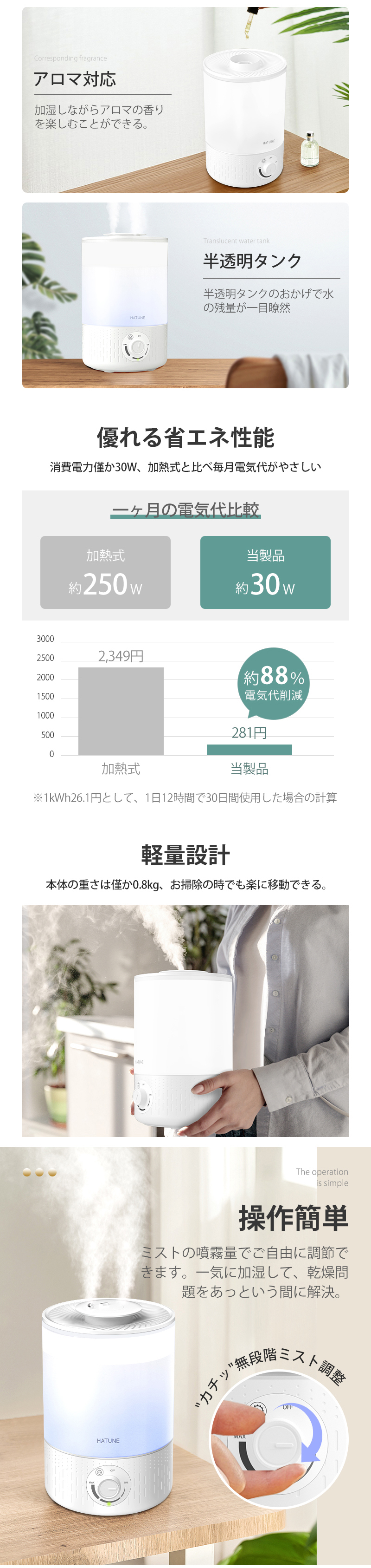 【5】超微細ミスト:自然蒸発しやすい超微細ミストで、加湿器の周囲が濡れにくい。