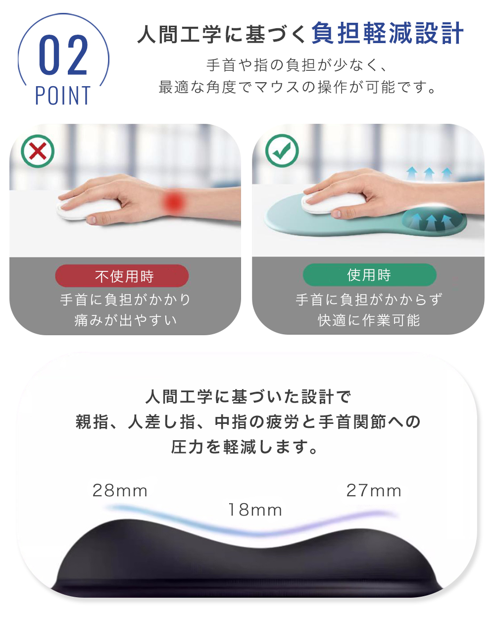 ・低反発クッションで手首の負担を軽減