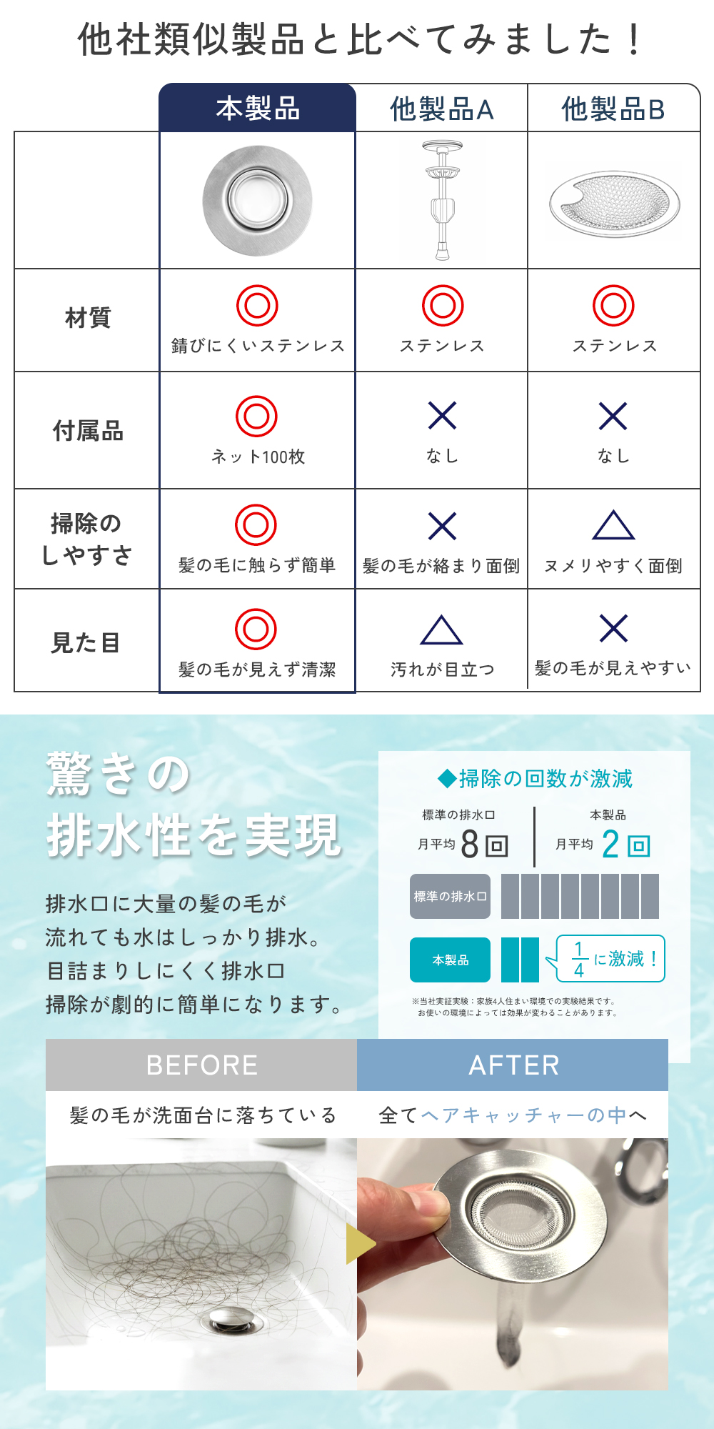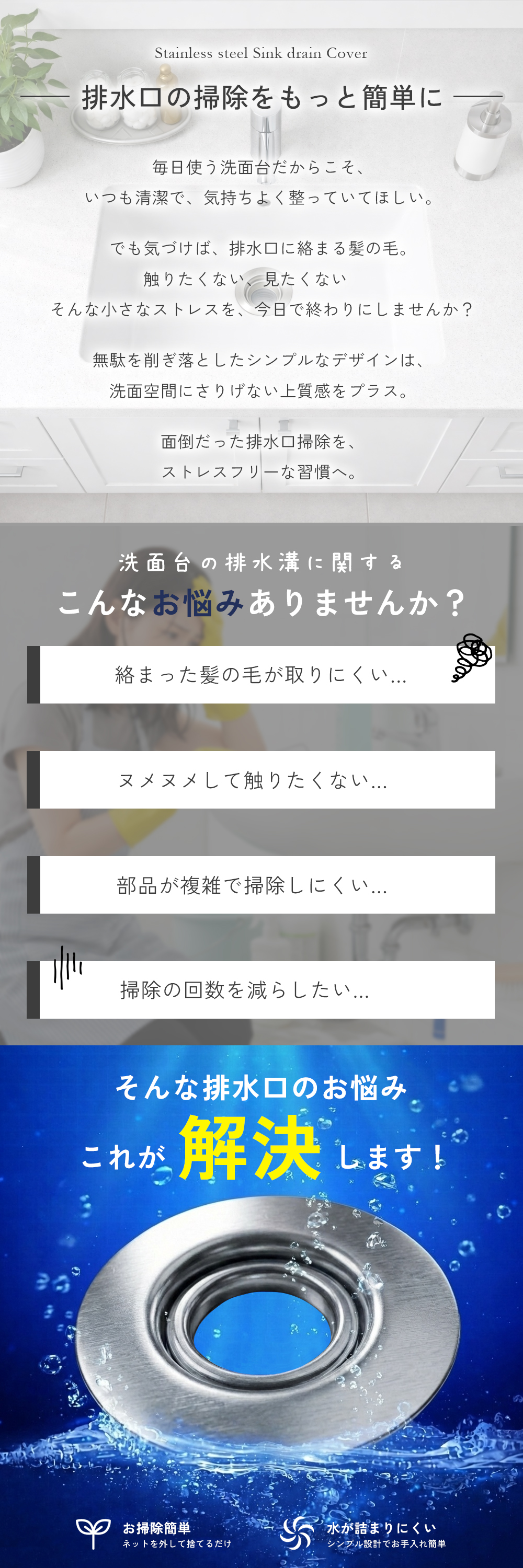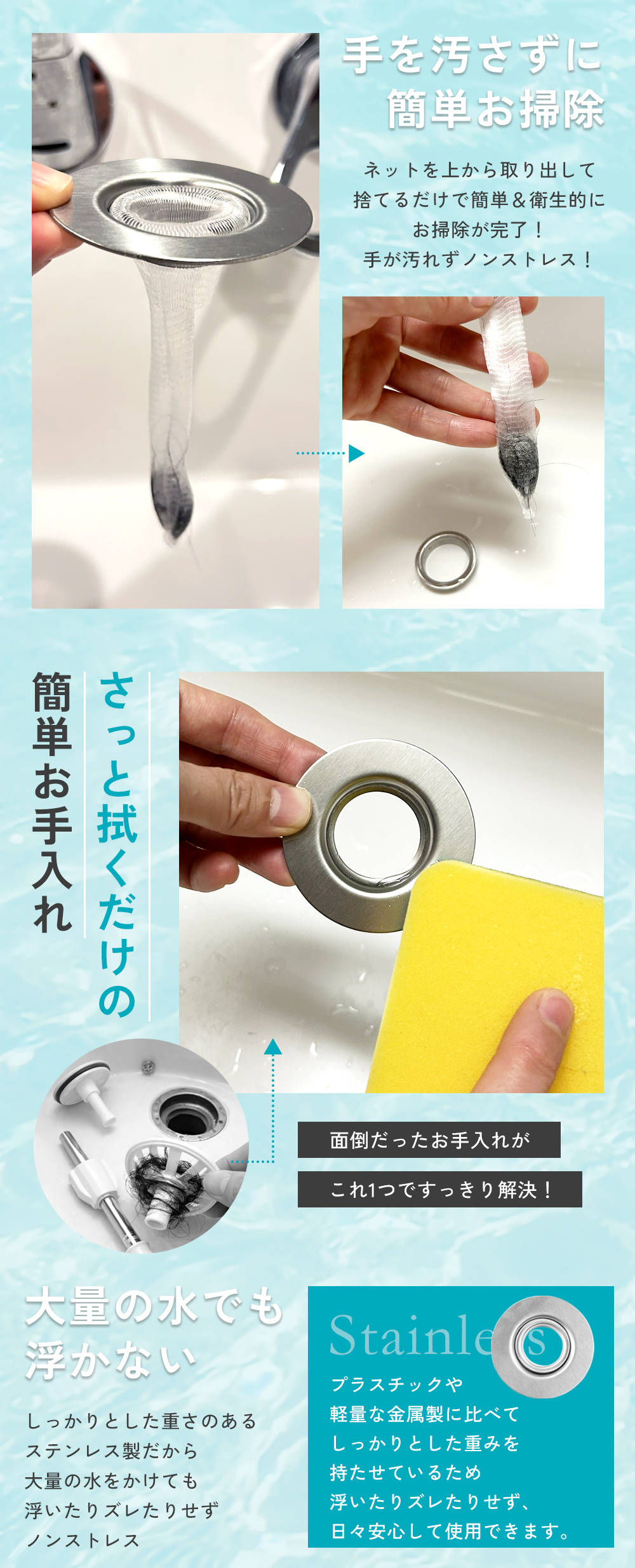 髪の毛やゴミをしっかりキャッチして、排水口の詰まりを防止。