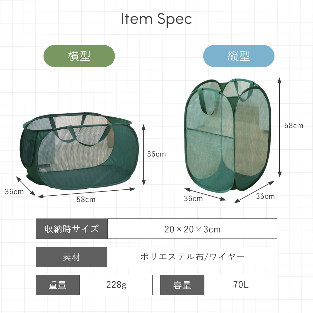 縦型:(使用時)36x36x58cm(収納時)20x20x3cm