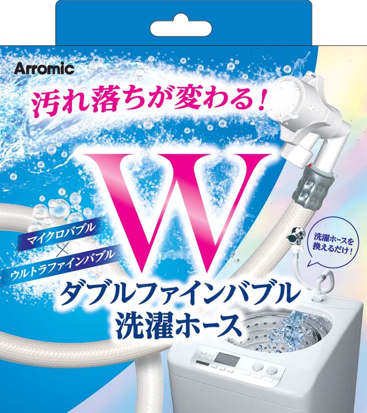 ダブルファインバブル 洗濯ホース 80cm/洗濯用品/ブランド:アラミック/【発売元、製造元、輸入元又は販売元】アラミック/【ダブルファインバブル 洗濯ホース 80cmの商品詳細】●ダブルファインバブルで汚れ落ちが変わる!洗濯ホースを取り換えるだけ!●マイクロバブル×ウルトラファインバブル。Wの泡のチカラで黄ばみと黒ずみを防ぐ!●洗剤を吸着したウルトラファインバブル(ナノサイズの泡)が繊維の奥まで浸透し、奥の汚れまで洗浄成分を届けます。●汚れを浮かせやすくし、洗浄成分が汚れをはがしとる効果を高めます。●マイクロバブル(マイクロサイズの泡)の力で繊維の表面についた汚れをはがし取ります。また、はがれた汚れの再付着を防いでくれます。●衣類はもちろん、洗濯槽までキレイに!●ホースの交換もカンタン!工具不要で簡単に取り付け・交換ができます。/cate70024