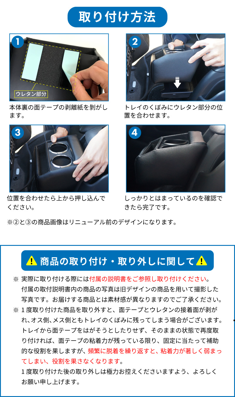 ・適合条件:純正のセンターコンソールに幅約13cm×奥行約14cm×高さ(厚み)約3cm(いずれも最長部を測定)の格納式小物トレイを備えている車両(詳細は画像をご確認くださいませ)