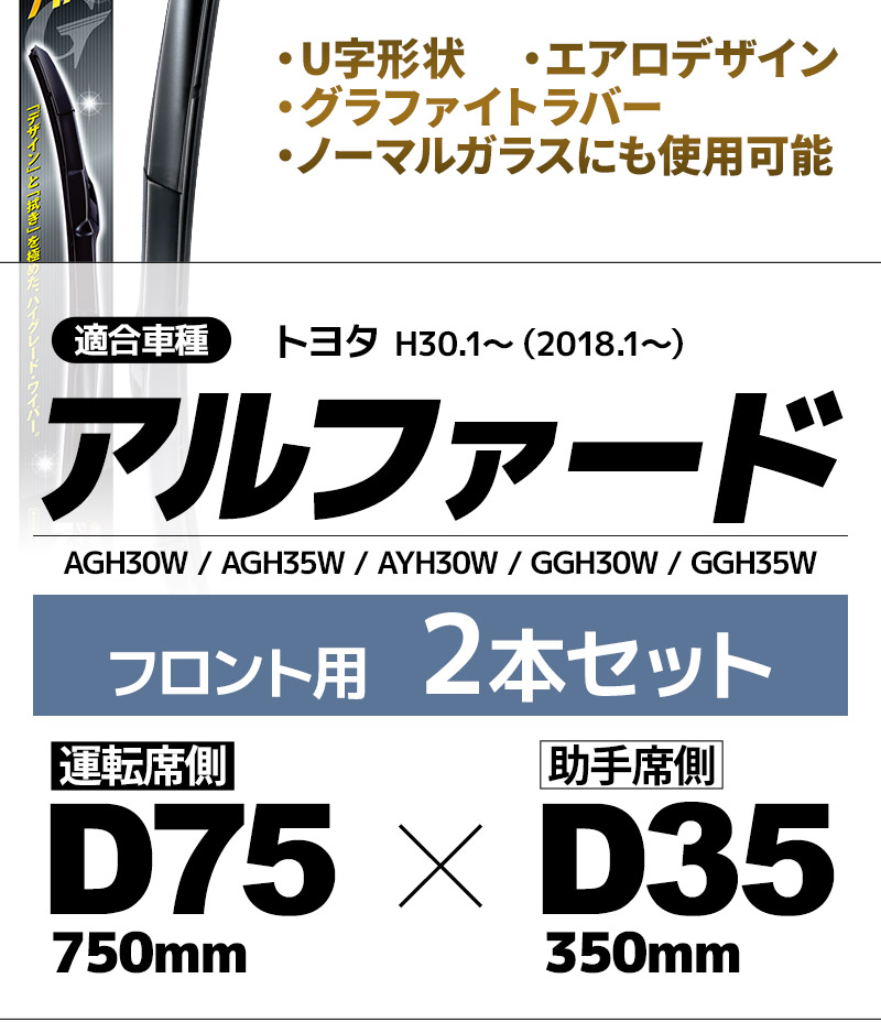 30系 アルファード(2018.1〜) 雨用ワイパーブレード フロント 2本セット デザインワイパー D75(750mm)+D35(350mm) 交換 ワイパーゴム 替えゴム NWB U字フック