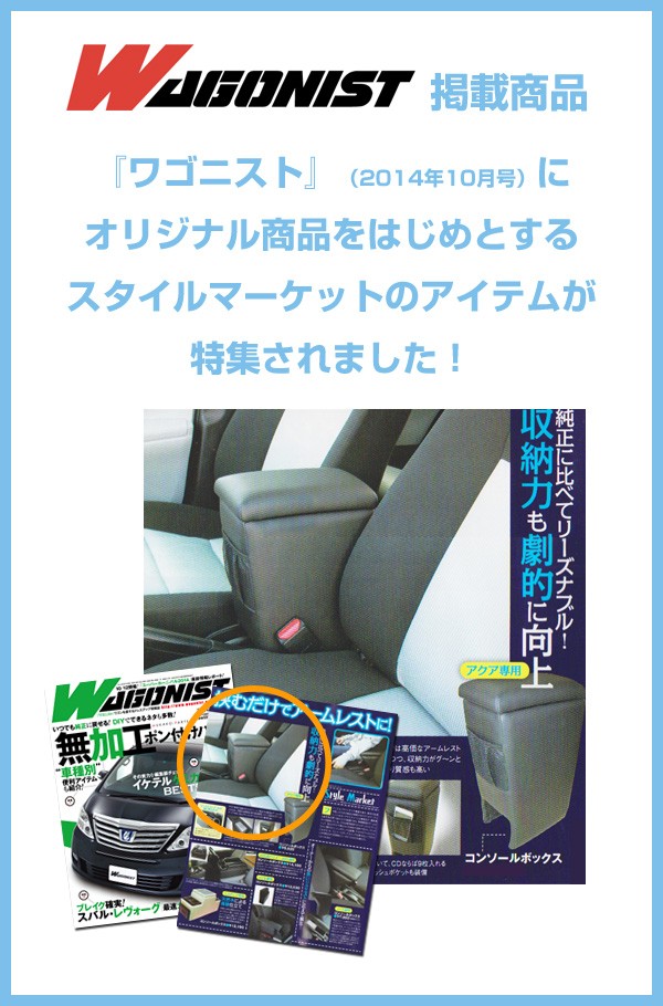 | アクア専用のアームレストです。 運転時の快適性を向上させるだけでなく、車内に散らかりがちなこまごまとしたものを整理する収納としても役立ちます。 【ぴったりフィット】 専用設計品ならではの、高いフィット感を実現しています。 【大型収納部&ネットポケット】 標準サイズのCD9枚を収納することができるメインの収納部に加え、製品前部にはカードや携帯電話などの収納に適したネットポケットを搭載しています。 【リーズナブルな価格】 純正品同等の装着感を実現しながら、リーズナブルな価格を実現。 【安心の国内生産品】 一方でクオリティにはこだわり、日本国内で製造を行いました。 【取り付け簡単】 本品の脚部を純正のコンソール(ドリンクホルダー)と座席の間に差し込むだけで簡単に取り付けを行うことができます。 【サイドブレーキに配慮した形状】 取り付け後もサイドブレーキが引きやすいよう、上部に行くに従って奥行きが広くなる、斜めの形状をしています。wagonist |