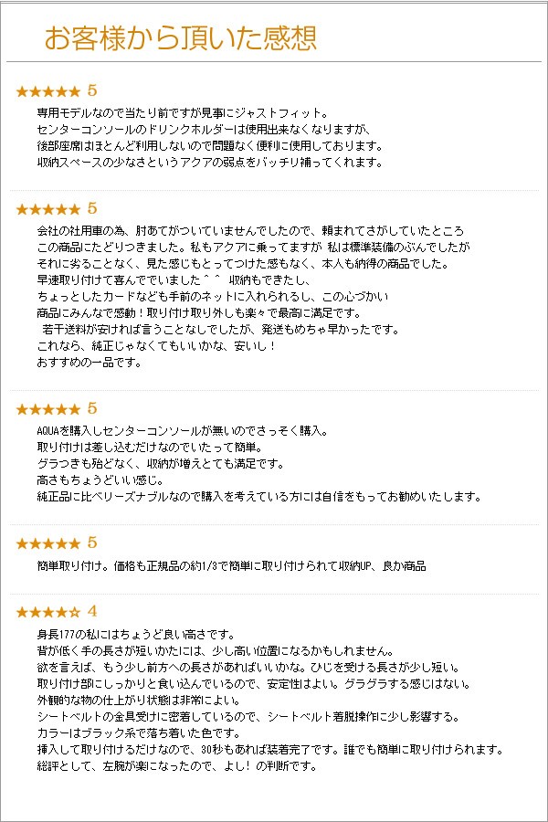 | 注意事項 ※標準装備されているドリンクホルダーに関して 純正のコンソールにかぶせるように取り付けをしますので、その部分に標準装備されているドリンクホルダーはご使用いただけなくなります。 ※適合に関して 本品はトヨタ アクア専用に設計された製品ですが、グレードや年式により、適合しない可能性がございます。(Gグレードは純正のコンソールが標準装備されていますので、取り付けできません。) 必ず、適合車種をご確認いただいた上で、お買い求めくださいませ。 ※素材感に関して 生産ロットによりレザー調素材の素材感が若干異なる場合がございます。 複数個お買い求めいただいた場合など、お届けする商品に複数種類の素材感の商品が含まれる場合がございますこと、あらかじめご了承くださいませ。 ※商品とパッケージ資材の状態に関して 商品や商品を包むパッケージ資材(ビニール)に白い粉末が付着している場合がございます。(商品とパッケージ資材とが張り付いてしまうことを防ぐためのものであり、濡れた布などで拭き取ることが可能です。) お客様よりこんなお問い合わせをいただきました Q:アクアのG’s(ジーズ)には、装着可能でしょうか? A:グレードがSもしくはLで、且つ差し込み部分が 5枚目の画像のような形状のお車でしたらお取り付けが可能です。 ご確認の上ご検討いただきますようお願いいたします。(但し2015/04月現在) |
