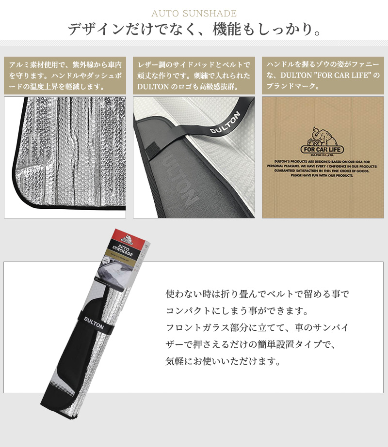 | 荒野を力強く駆け抜ける四駆を思い起こさせる折りたたみサンシェード。 パッチには型押し、ベルトには刺繍で仕立てたDULTONロゴが 収納時にも高級感と満足感を演出。 豊富なカラーバリエーションもポイントです。 アルミ素材で日光を反射し、車内の温度上昇を軽減します。 太陽光に含まれるUV(紫外線)を反射しますので、ダッシュボードの劣化や運転前のハンドルの高温化を抑制します。 特に高温な季節に長時間ご使用いただく場合は、銀色の面を表にしてご使用いただくと劣化防止となります。 【ご使用方法】 1. サンシェードを下辺のダッシュボードの奥側に差し込むようセットして下さい。 2. サンシェードの上辺はルームミラーの後ろに通して下さい。 3. 運転席側、助手席側のサンバイザーでサンシェードの上辺を押さえて下さい。 関連キーワード:DULTON 車 サンシェード フロント 日よけ 紫外線対策 遮光 吸盤なし 車用サンシェード 車用 フロントガラス ダッシュボード ハンドル保護 カーシェード カーサンシェード 日除け ダルトン アコーディオンタイプ AUTO SUNSHADE シンプル かっこいい おしゃれ おすすめ プチギフト プレゼント ノベルティ 父の日 ジムニー ハスラー ラパン プロボックス キューブ N-BOX タフト タント ハイゼットカーゴ dulton dutass |