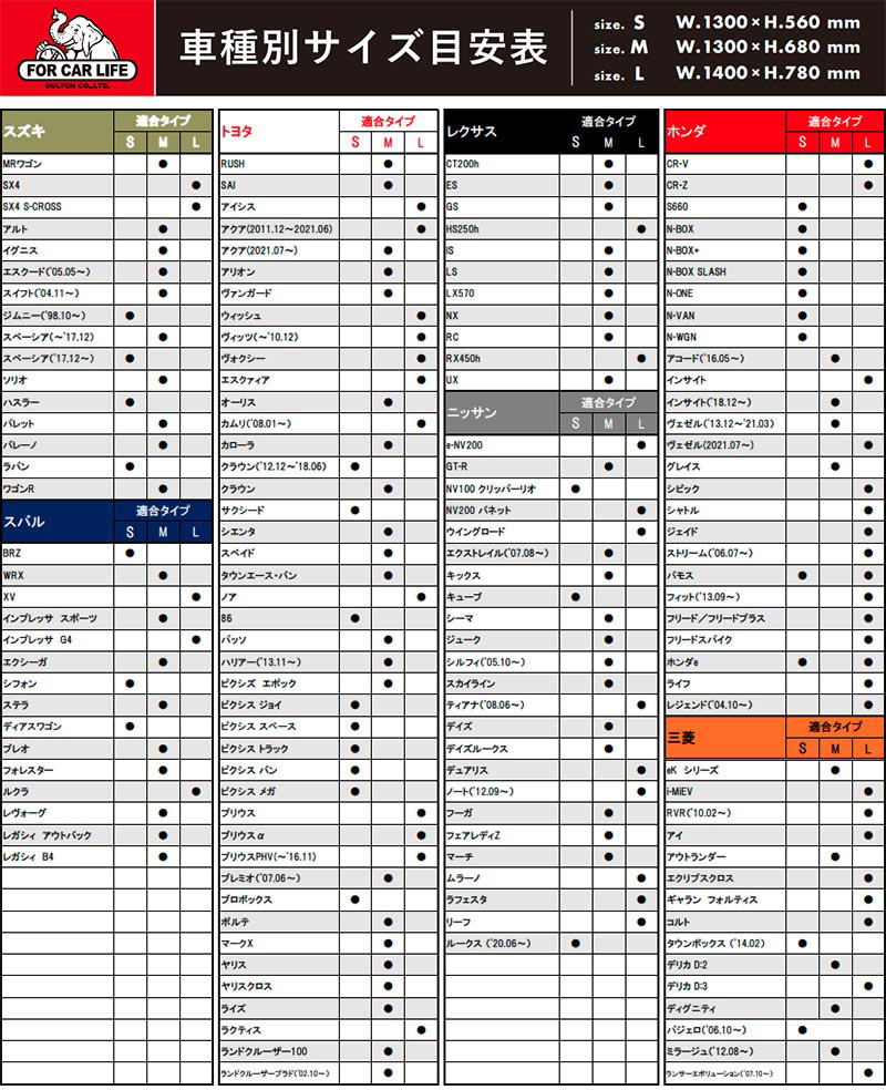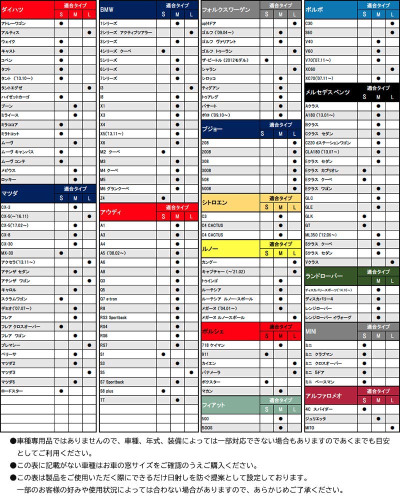 ※適合車種は目安です。ピッタリ嵌る事をお約束するものではございません。実際のお車の窓の大きさを計測してお買い上げ下さい。