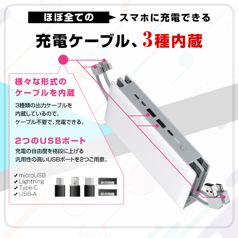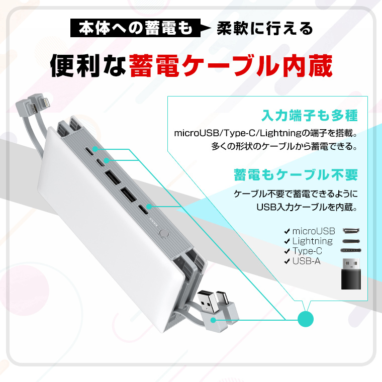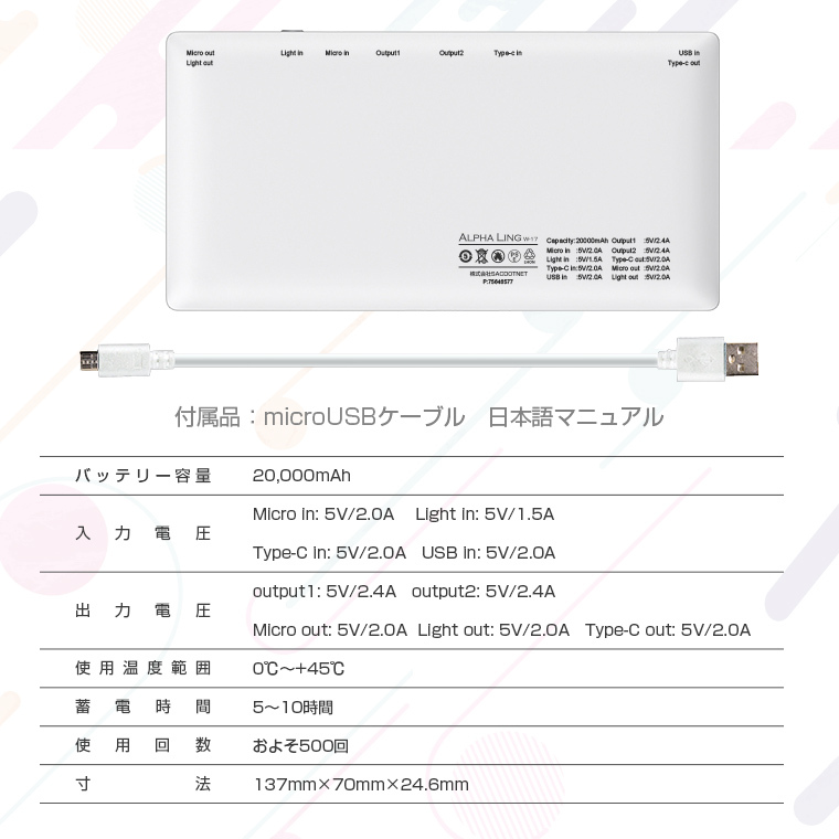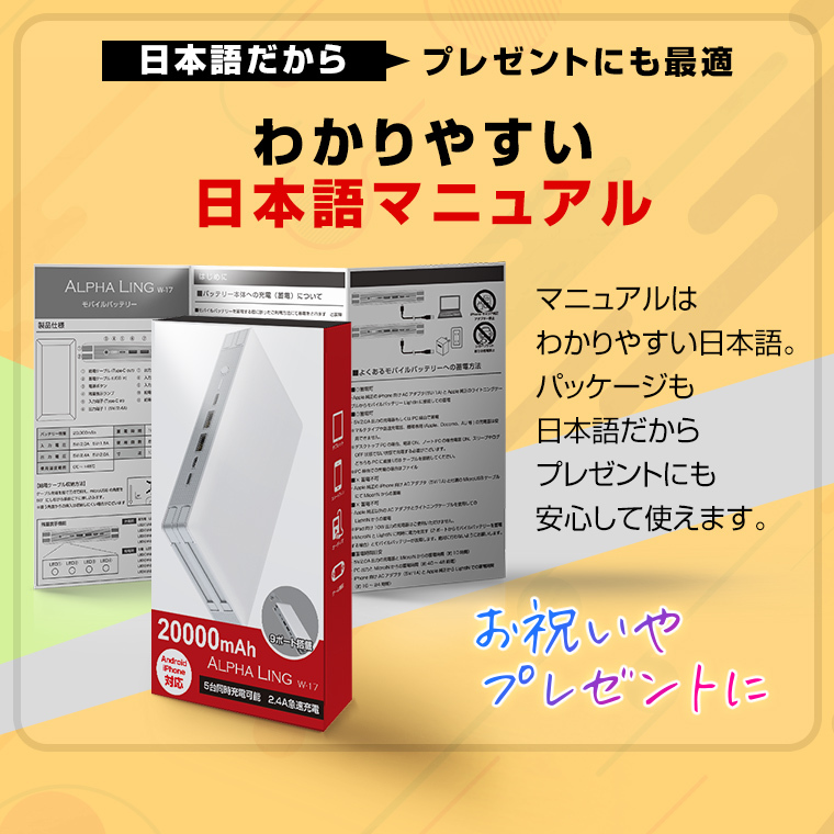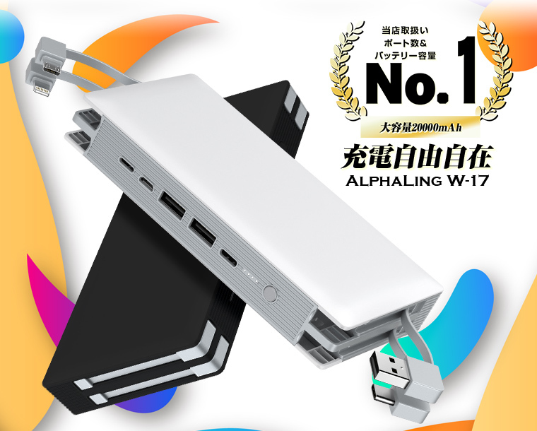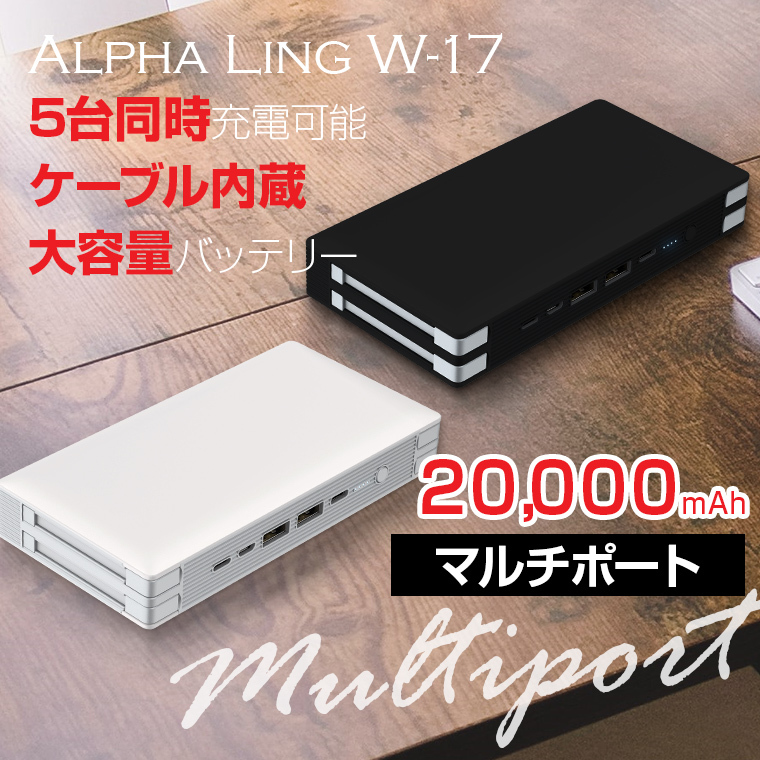モバイルバッテリー 20000mAh 名入れ 送料無料 | 同時充電5台 ケーブル内蔵 急速 iPhone/microUSB/TypeC 20000mAh ALPHALING W-17