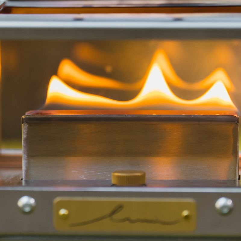 | 本体の4面全てに大きなガラスを採用することで、どの角度からでも炎の揺らぎを存分に鑑賞できます。 テーブルの上に置けば、360度に光が広がり、空間全体をやさしく包み込みます。 まるで焚き火を囲んでいるような贅沢なひとときを、コンパクトなサイズで楽しめるのが大きな魅力です。 |