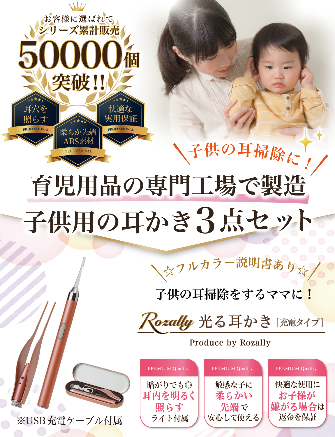 様々なメーカーから 子ども用 の みみかき 用品として” 耳掃除セット ”や” 光る耳かき + ピンセット ”が販売されていますが、