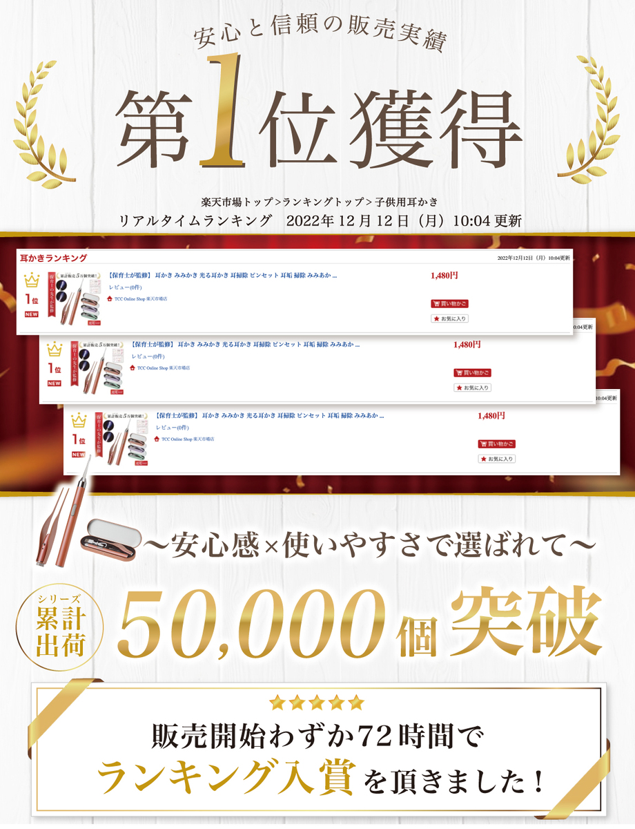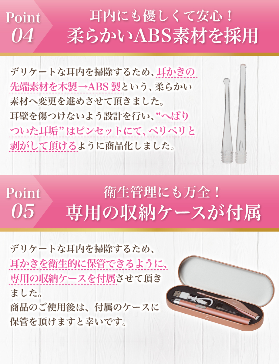 照明付き の先端部が 光る 設計にすることで 耳 を ライト で照らして 耳掃除 がラクラクできる仕様に改良。