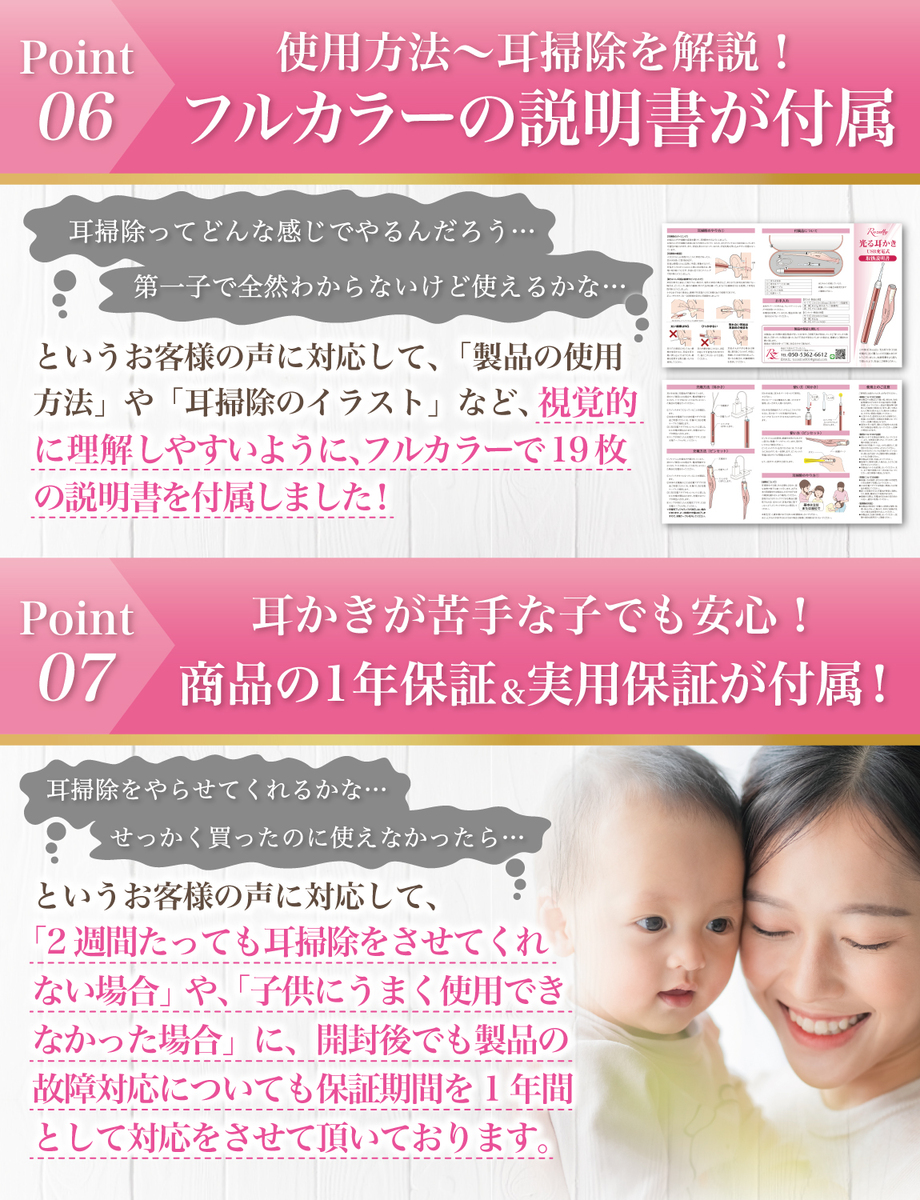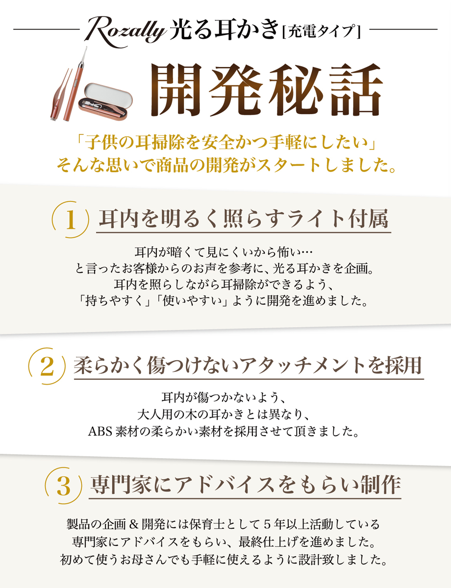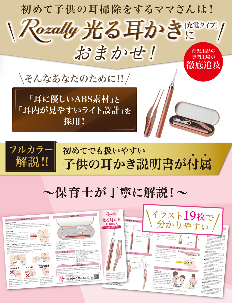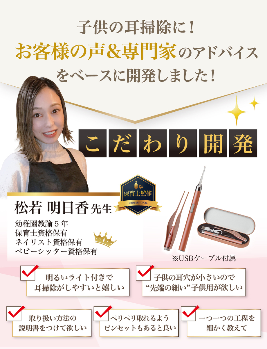 子供用 の 耳垢掃除 や 定期的な 耳かき の 方法 など色々な使用方法を説明書として添えて企画&開発。