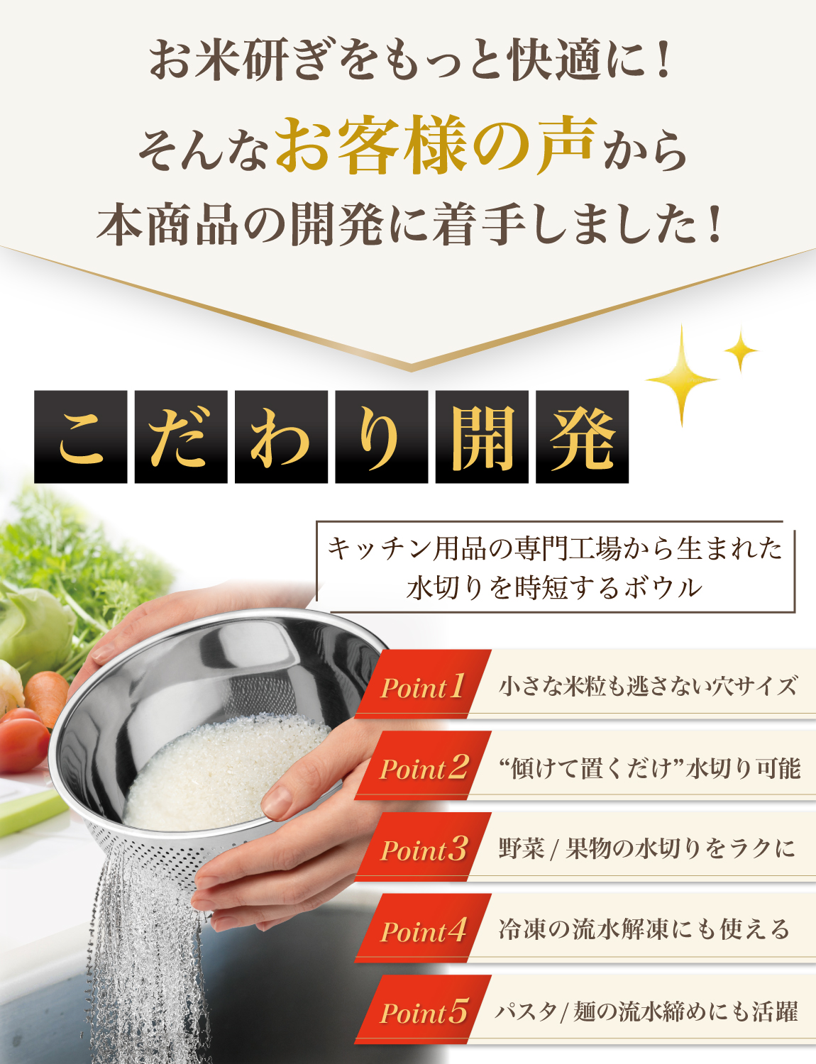 「小さな米粒も流さないように研ぎたい」「野菜の水切りをラクにしたい」という